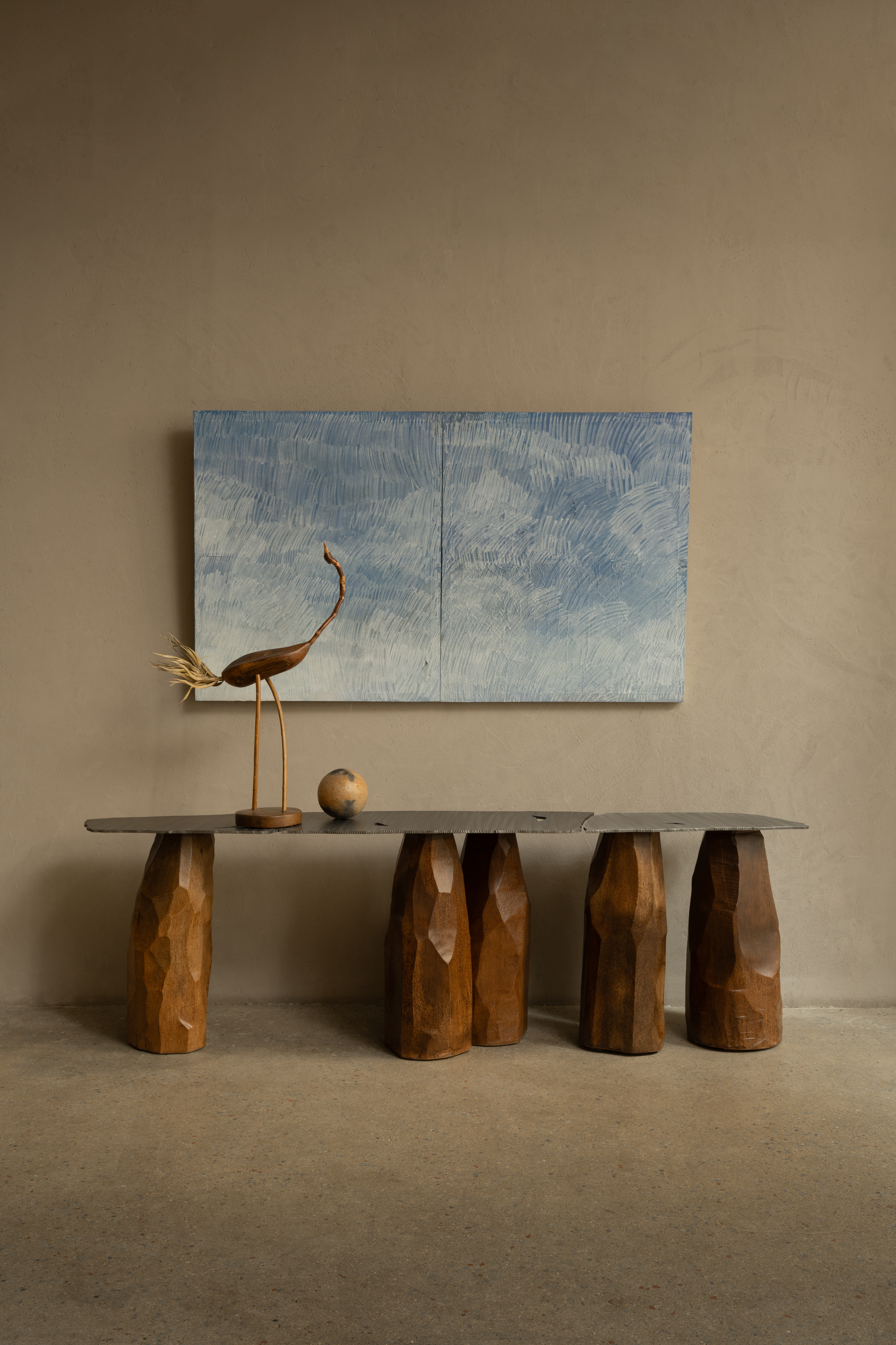 La console « Jabal » (Montagne), pièce unique mise en vente le 16 avril prochain chez Piasa (estimation : 12 000 / 18 000 €), incarne ce travail poétique et singulier. Composée de cinq pieds semblables à des obélisques taillés par le vent et par d’anciennes mers lointaines, elle tire sa force de la texture riche et profonde du bois de palmier. Chaque pied est façonné à la main, faisant de cette base une structure organique où le geste de l'artisan est omniprésent.