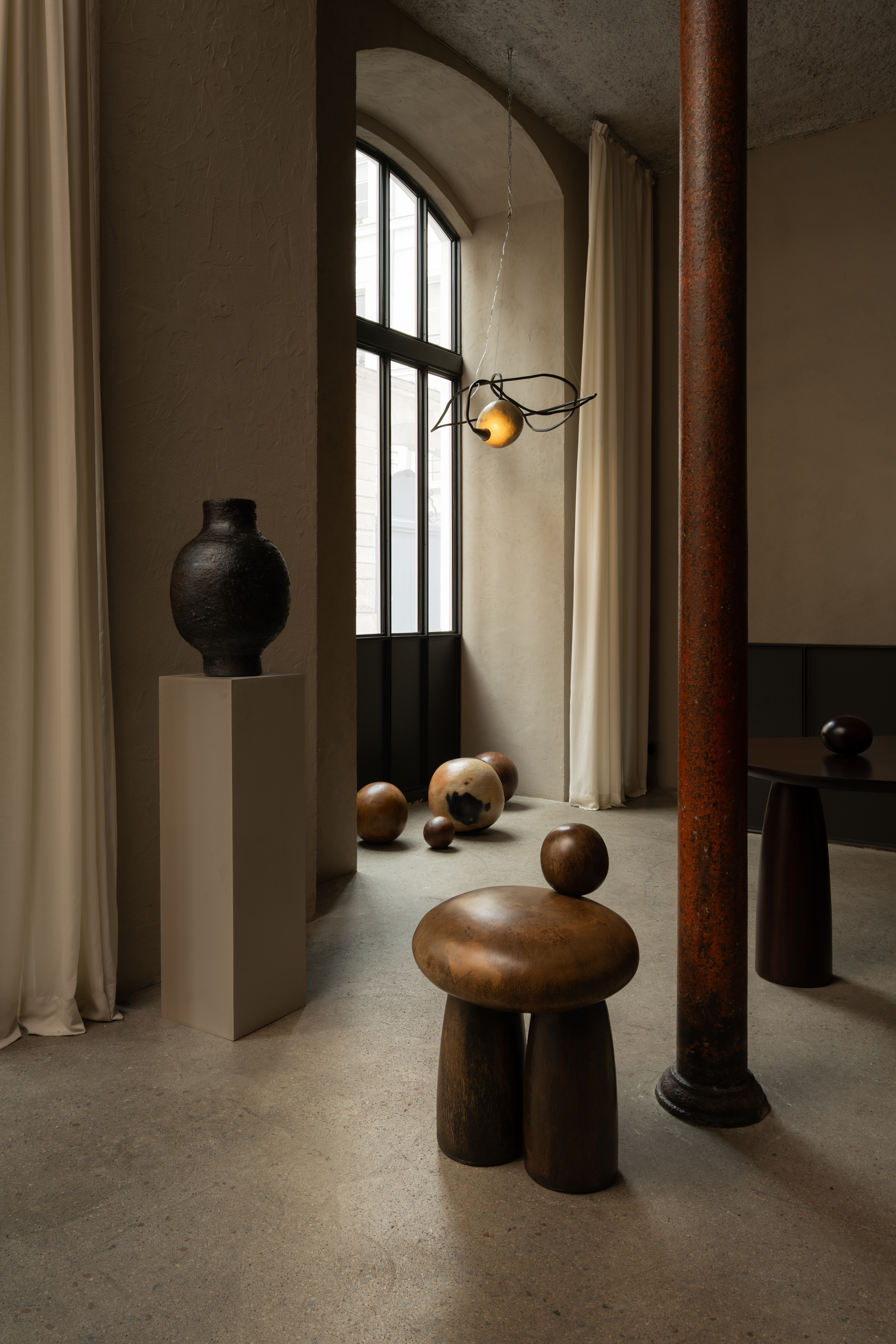 Le plateau, fait d’acier perforé, meulé à la main et festonné sur la tranche, semble avoir été altéré par le passage des millénaires. L’ensemble constitue un dialogue total entre rigueur architecturale et émotion artisanale. En découvrant ce minimalisme organique, ce n’est plus simplement un objet de design que nous avons devant nous, mais l’âme d’un paysage et de cette humanité que nous partageons, faisant de chaque création, selon le titre de la vente, un héritage du futur.