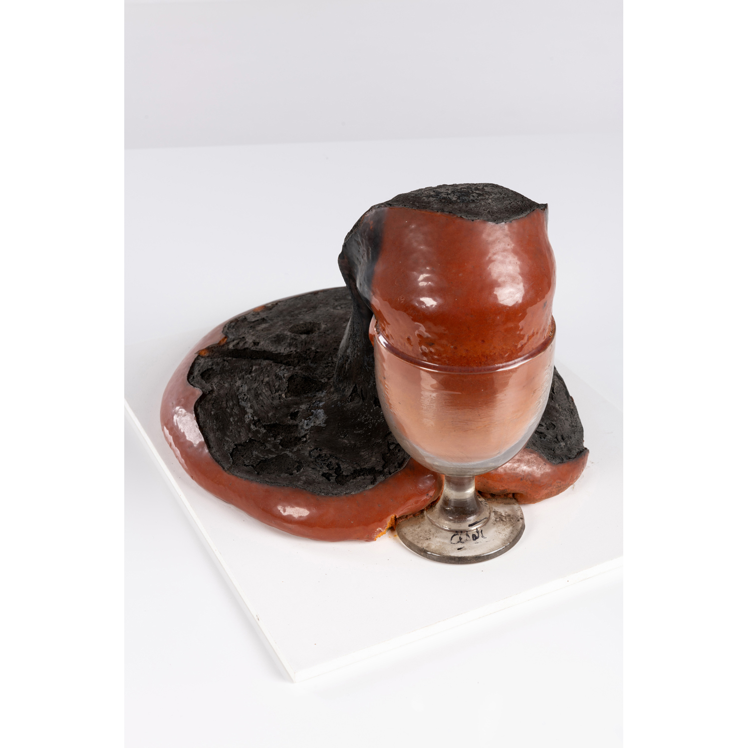 Réalisée en 1967, l’œuvre proposée à la vente date des premières recherches de César dans ce domaine. La mousse débordant d’un verre à pied, coulée en polyester translucide, teintée dans des tonalités orange et brûlée en surface. L’effet de surprise produit n’éclipse pas la beauté esthétique de l’œuvre.