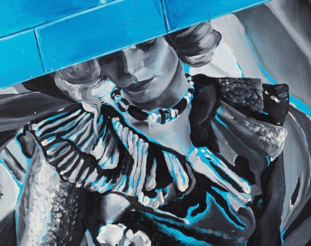 Le fond monochrome bleu dans lequel il fait baigner ses tableaux maintient à distance la réalité.
