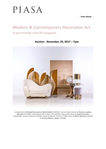 Paris, October 2017 – PIASA and French magazine AD are again teaming up for another, 162-lot auction of furniture and decorative art featuring leading 20th century names and the most innovative talent of today.