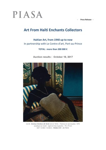 Paris, October 2017 - A packed saleroom greeted PIASA’s sale of art from Haïti on Thursday 19 October 2017, held in partnership with the Art Centre of Port-au-Prince to generate funds for the Centre’s renovation. The auction crowned a week of Haïti-inspired events, including a concert at the New Morning and a musical vernissage starring Ayiiti, James Germain and James Noël at PIASA a few days before the sale.
