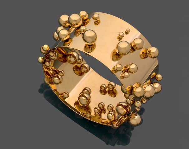 Puisant son inspiration dans la nature, le Surréalisme et l’Art nouveau, l’artiste a créé un très grand nombre de bijoux au cours de sa longue carrière. Son univers fantastique est soutenu par le galeriste Alexandre Iolas, puis par de nombreuses commandes de grands collectionneurs tels qu’Yves Saint Laurent. Grâce au moulage, l’empreinte et la galvanoplastie, l’artiste matérialise baies et fleurs en les recouvrant d’une pellicule de métal comme en témoigne le collier « Ginkgo ».