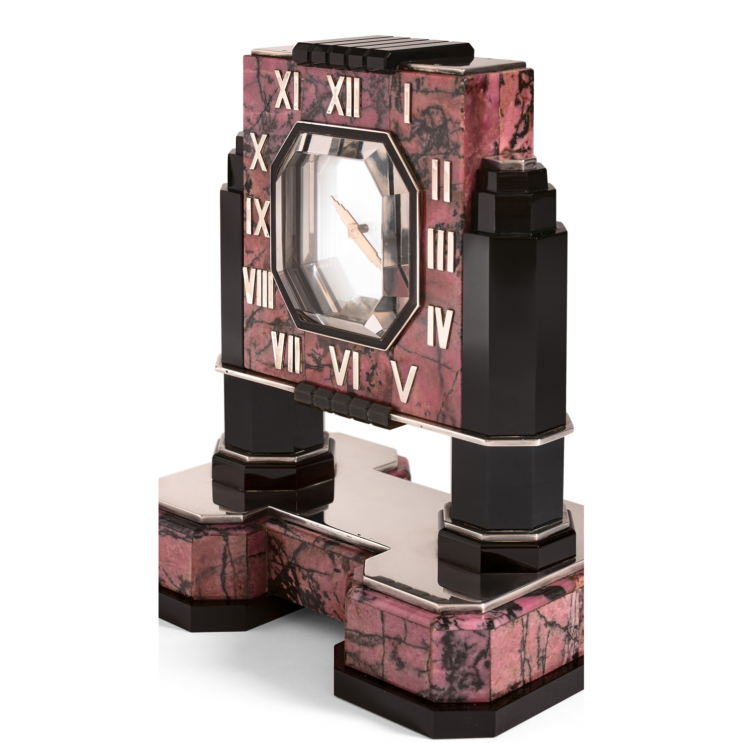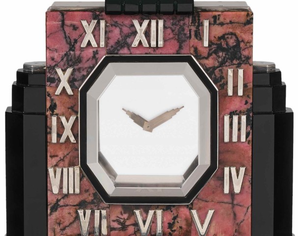 La pendule mystérieuse proposée dans cette vente présente les principales caractéristiques des horloges Cartier de style Art Déco. En effet, la juxtaposition savamment équilibrée des matériaux utilisés participe à l’harmonie de cette pièce en mêlant la profondeur chatoyante de l’onyx avec les reflets métalliques de l’argent, les marbrures contrastées de la rhodonite et la transparence du cristal. De plus, les lignes simples et les volumes habilement rythmés de son dessin subliment l’élégance et la délicatesse de ces matières. Même si chaque pendule mystérieuse créée par les ateliers Cartier est par définition une pièce unique, certaines particularités placent cependant ce modèle quelque peu atypique dans un registre tout à fait singulier au sein des collections de la maison. Le caractère architectural brut choisi ici nous éloigne des influences asiatiques plus habituelles et nous fait voyager vers l’ouest. Les portants en onyx rappellent les silhouettes rectilignes, classiques et conventionnelles des gratte-ciels construits outre-Atlantique selon le plus pur style Art Déco américain, le premier de ces bâtiments étant le Reynolds Building élevé à Winston-Salem (Caroline du Nord) en 1929. Cet immeuble sera à l’origine de la conception de plusieurs autres gratte-ciels emblématiques dont le plus connu est l’Empire State Building, inauguré sur l’île de Manhattan le 1er mai 1931. L’examen des aiguilles qui reprennent la forme de cet immeuble (sans l’antenne qui sera placée en son sommet en 1952) confirme l’inspiration par ce nouveau style architectural, et nous permet d’affirmer que la création de cette pendule date du début des années 1930. Par ailleurs, un dessin de 1930 à la mine de plomb, aquarelle et encre de chine d’un projet de pendule dont les portants, le corps de l’horloge et les aiguilles sont très similaires aux caractéristiques de celle présentée ici, nous permet de soutenir cette hypothèse. Ce qui est également atypique sur le modèle présenté est l’utilisation du chiffre romain IV en lieu et place de l’index IIII habituellement rencontré sur la quasi-totalité des pendules mystérieuses conjointement créées par Maurice Couët et les ateliers Cartier. Un autre exemple de l’utilisation de ce chiffre romain IV est visible sur une pendule mystérieuse datant de 1931 dont le cadran est en aigue-marine, illustrée dans le livre ‘Jeweled splendors of the Art Deco Era : The Prince and Princess Sadruddin Aga Khan Collection’ par Stephen G (p.206). Harrison. Par ailleurs, le chiffre romain V fixé sur notre pendule est plus large que sur l’affichage des index VII et VIII, à l’instar de l’horloge de 1930 ayant appartenu au Roi Alexandre 1er de Yougoslavie (photographie par Clive Kandel, Collection privée). Ces derniers éléments sont donc autant d’indicateurs de la période à laquelle cette pendule mystérieuse a été réalisée. Enfin, cette horloge s’inscrit parfaitement dans les canons stylistiques de l’époque, selon lesquels la ligne sert la fonction. Ainsi malgré son aspect monumental de prime abord, c’est bien la fonction horlogère de la pendule qui est mise en avant, notamment grâce à la sobriété de ses lignes et à la clarté de la transparence de son cadran mystérieux, contrebalancée par l’espace ouvert de sa construction en demi-portique.