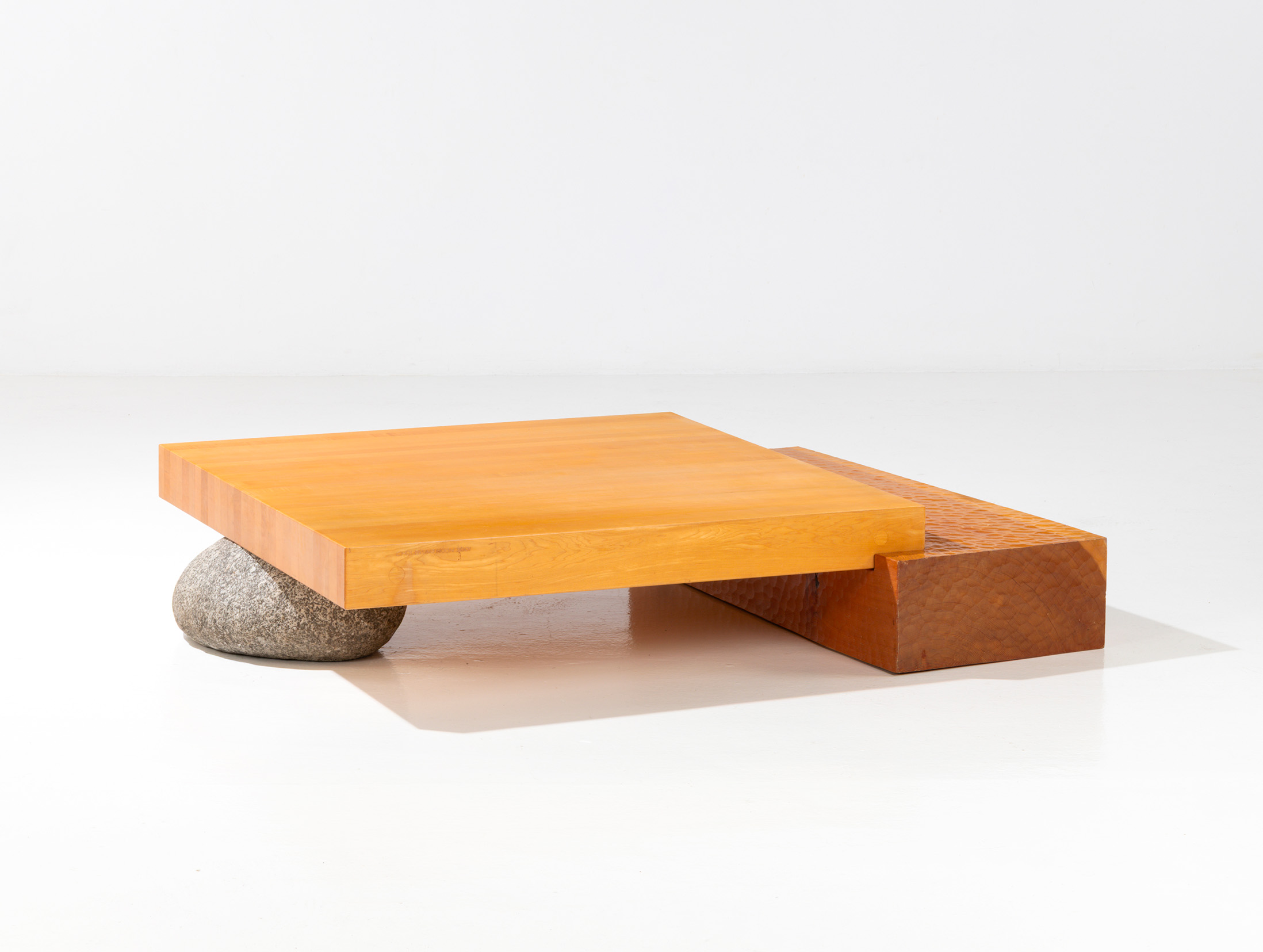 « Les matériaux que j'utilise […] ont chacun leur propre histoire et leur propre énergie Mon processus consiste à trouver l'harmonie dans leurs contrastes et à célébrer la beauté tranquille qui se dégage de ces formes naturelles. » La table basse modèle 'Afterimage 01-111' (18 000 / 25 000€) représente cet équilibre entre la dureté du basalte, l'éclat de l’érable, la douceur du plateau sculpté à l’herminette.