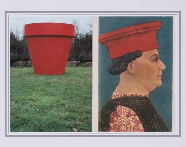 Intitulée « Pot 815, Jean-Pierre Raynaud, 1968-Francesco Sforza Bembo », la seconde pièce proposée à la vente est une juxtaposition de deux cartes postales annotées au dos. Tandis que la première image évoque l’une des œuvres les plus emblématiques du plasticien français Jean-Pierre Raynaud (né en 1939), la seconde est une reproduction d’un portrait de Francesco Sforza peint au milieu du quattrocento par Bonifacio Bembo et actuellement conservé à la Pinacothèque de Brera à Milan.