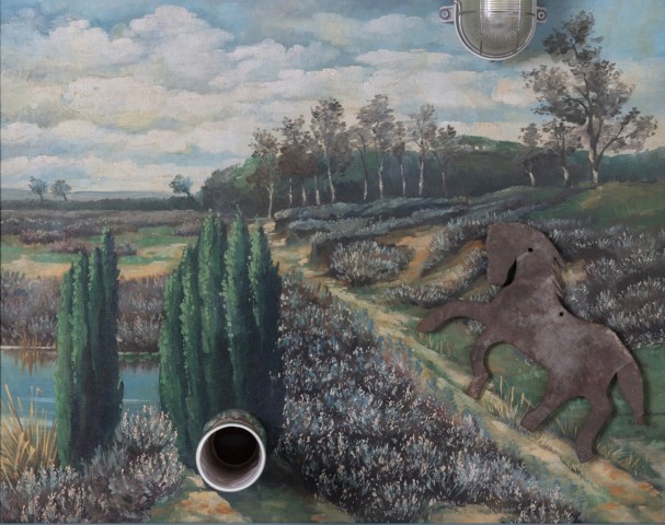 Datée de 1986, « Détrompe l'œil, le cheval évadé » est emblématique du travail de l’artiste. Sur une toile peinte marouflée sur panneau de bois représentant un paysage champêtre une lampe et la silhouette d’un cheval ont été collées. La juxtaposition entre la profondeur feinte du tableau et l’exacerbation de la surface crée une trouble dans l’œil du spectateur et interroge les frontières de la notion de créativité.