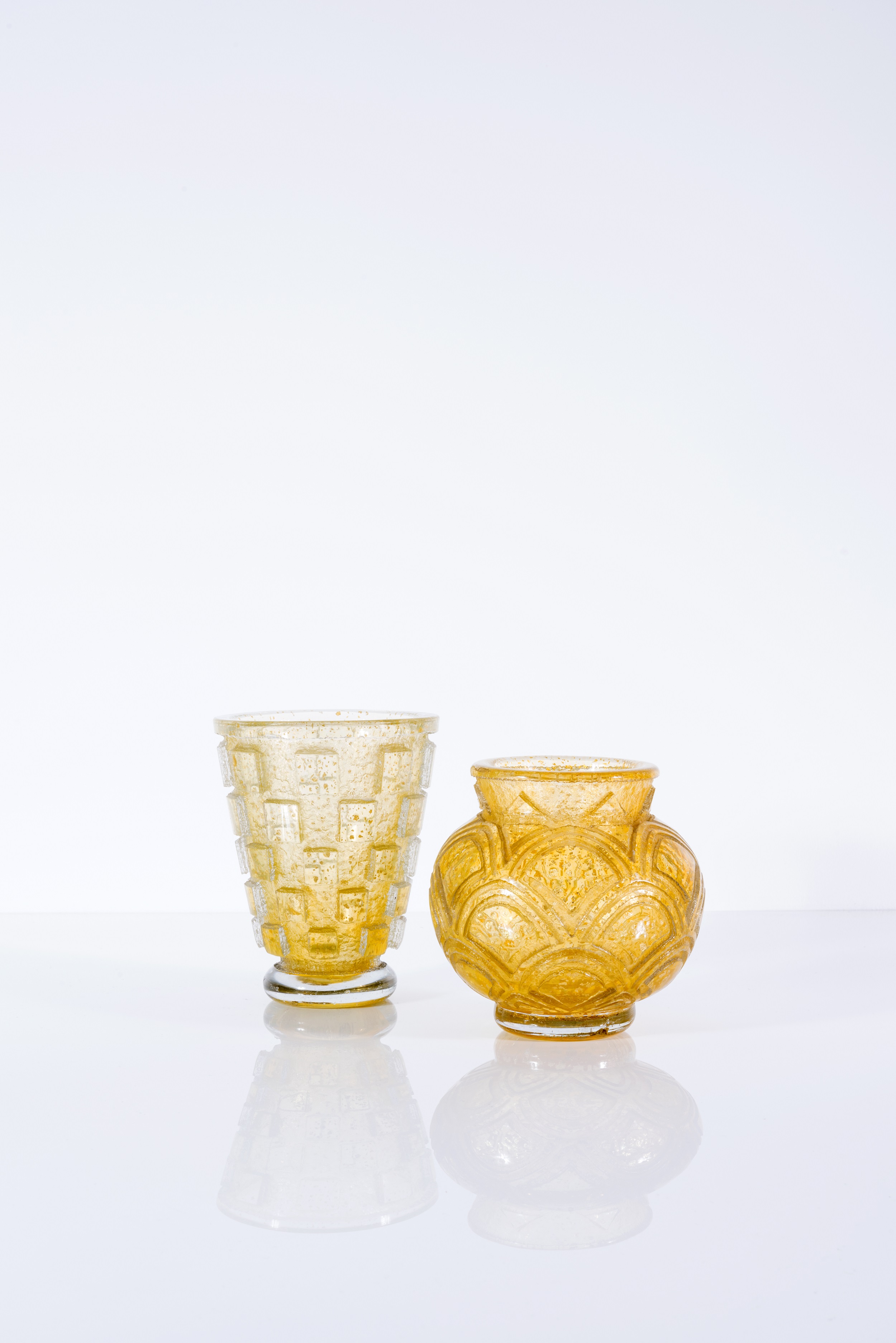 Deux vases en verre gravé à l'acide réhaussés de paillons d'or
