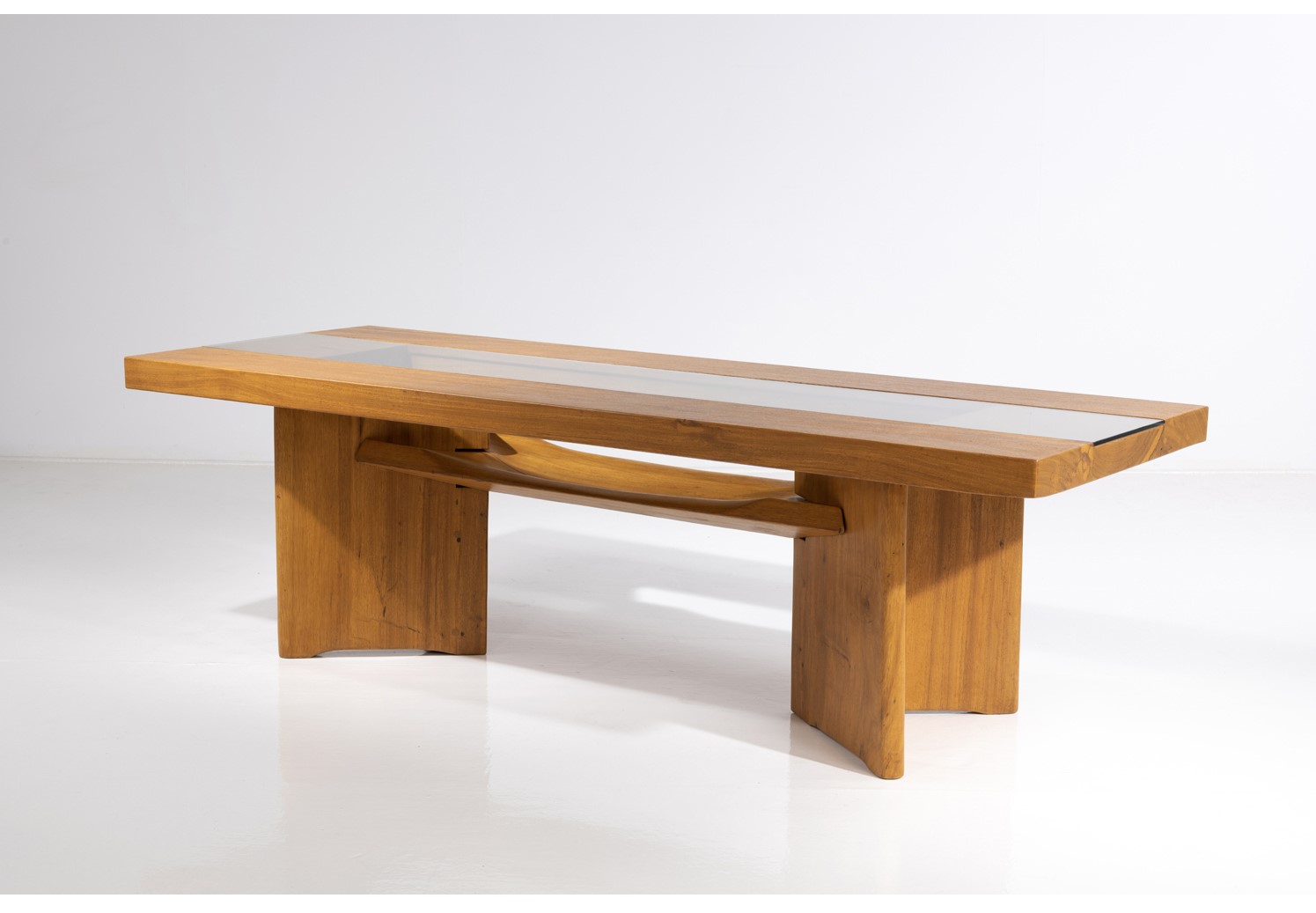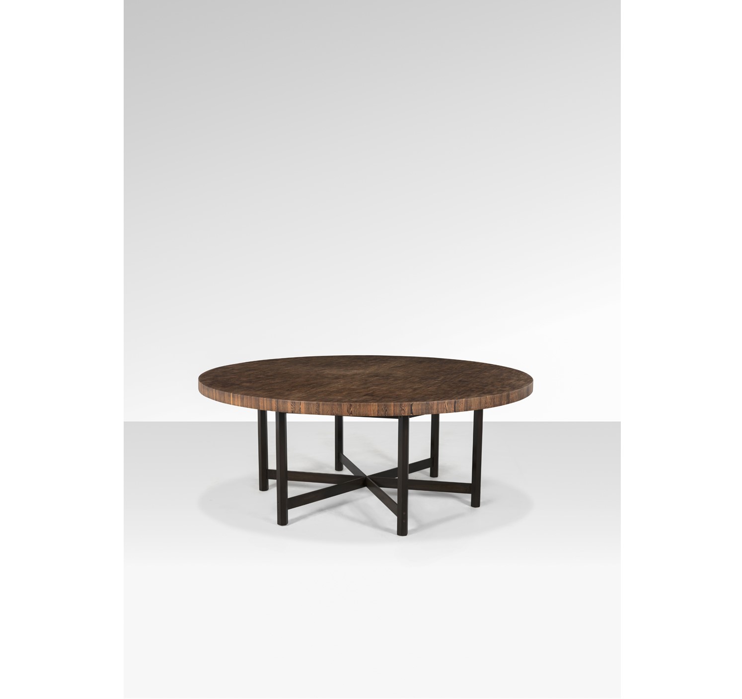 On soulignera ainsi la présence de plusieurs pièces remarquables, telle cette table en bois de pequi, pièce unique signée du Brésilien José Zanine Caldas ou bien encore ces modèles réalisés par les Belge Ado Chale et Jules Wabbes ainsi que toute une série dessinée par l’Italien Angelo Mangiarotti. Egalement témoins de la grande diversité de la sélection, ces tapis de l’artiste américain Alexander Calder dont un réalisé par la tapisserie d’Aubusson, des luminaires du Finlandais Paavo Tynell parmi lesquels ce lampadaire dessiné pour l’hôtel Aulanko en Finlande, ces commandes spéciales (tables, consoles…) de l’Américain George Nakashima ou encore cette série de chaises en paille tressée de Charlotte Perriand… Enfin, on notera ce très bel ensemble de chaises, tabourets, table, banc… signés Pierre Jeanneret tiré de la collection de mobilier pour Chandigarh.