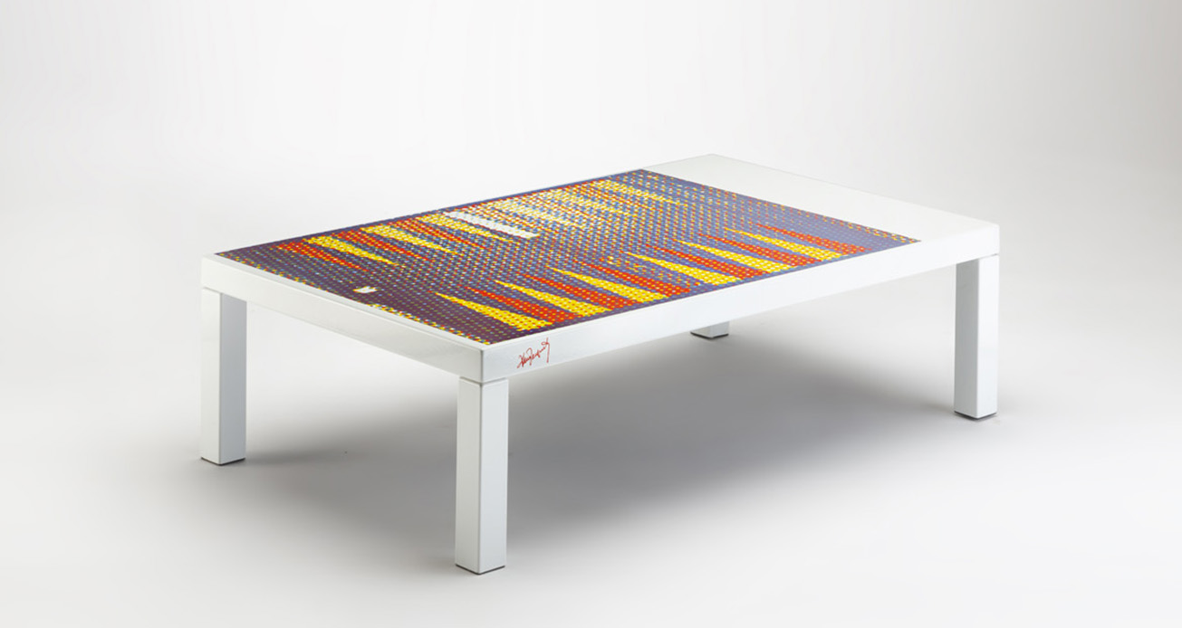 Il exprime alors le souhait de réunir deux mondes jusqu’alors antagonistes, celui de l’art et celui de l’objet. Cette aventure, dont le manifeste a été rédigé par le célèbre critique Pierre Restany en 1968, a un nom, L’Atelier A. Le concept, réunir les artistes contemporains autour de la création de meubles et de luminaires. Plus de 50 créateurs, pour la plupart ses amis, répondent présents. Parmi les plus connus, Arman, César Annette Messager ou Bernar Venet. L'artiste Alain Jacquet réalise un exemplaire de l’une des pièces les plus iconiques du groupe : la table basse sérigraphiée sur métal (Pointillisme, édition MMM, 3 000 / 4 000 €).