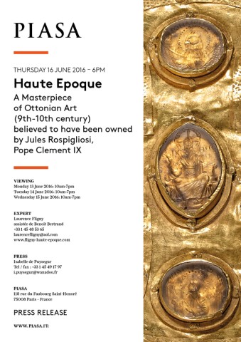 After obtaining a world record price of €2.2m for a Baroque ivory group of The Flagellation last December, PIASA – assisted by the expert Laurence Fligny – are delighted to present a masterpiece of 9th/10th century Ottonian Art: an exceptional gold cross with five rock crystal intaglios featuring Christ in Majesty and the Tetramorph.