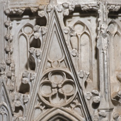 According to family tradition, the cross once belonged to Jules Rospigliosi – Pope Clement IX (1667-69). The cross seems to be of homogenous fabrication. It consists of finely cut gold leaf, rimmed with decorative metal strips that provide rigidity. These strips have patterned stamping that must have been applied after they were fixed to the cross, as traces of the patterning can be seen on the back. The heads of most of the rivets – whether used to fasten the strips or the framed mountings around the crystals – are marked with rosettes, reinforcing the cross’s stylistic unity. The edges retain traces of nails in places, suggesting the cross was originally fixed to a (probably wooden) support – either inserted into the binding-cover of a Gospel (in line with the theme of the tetramorph), or to a pectoral cross made for a high-ranking cleric.