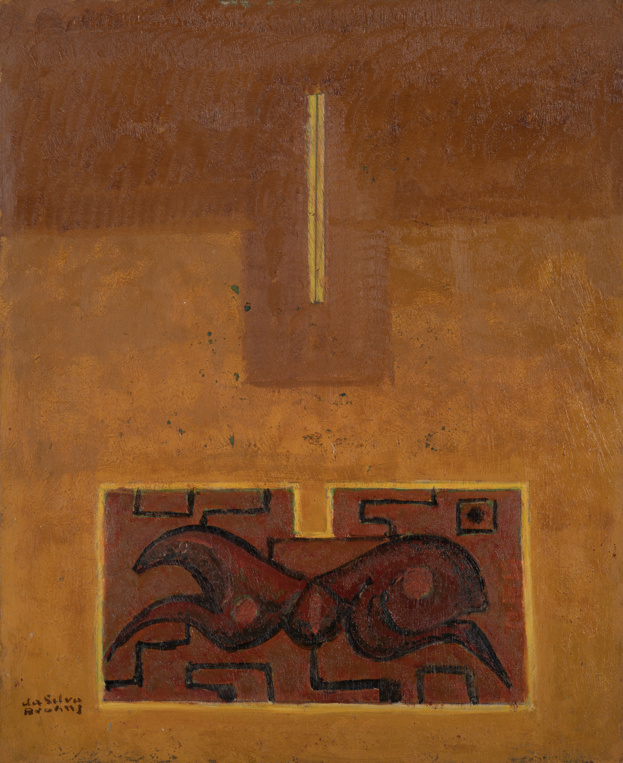 Influencé par le cubisme et plus particulièrement par Picasso, il adopte des formes entrelacées soutenues par de simples motifs qui vont le conduire vers la pratique de la tapisserie dont il va devenir un acteur de premier ordre. A ce titre, il participe à de nombreuses expositions en France et à l’étranger, et réalise plusieurs commandes de tapis pour les ambassades, les palais nationaux et les grands paquebots. Cependant, après la Seconde Guerre mondiale, Ivan Da Silva Bruhns abandonne la tapisserie pour revenir à la peinture. Il continue d’appliquer des principes qu’il suivait déjà et propose des œuvres très géométriques aux coloris très denses.