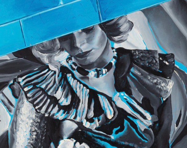 En 1962, Jacques Monory prend ses distances avec l’esprit du Pop art américain, refusant de limiter son propos à la dénonciation de la société de consommation, pour s’orienter vers une peinture s’attachant à une description neutre et froide du quotidien. Il se met à travailler par série, donnant naissance à un monde romanesque et noir inspiré par l’objectivité de la photographie, avec des images montrant des scènes de meurtre, de fuite, où la peur, les désirs, les émotions peuplent des lieux vides et mystérieux. Sa peinture s’inscrit alors dans le mouvement du retour à la figuration inspirée de la vie quotidienne et avec, entre autres, Arroyo, Klasen, Rancillac et Télémaque, il participe à l’exposition « Mythologie quotidiennes » au Musée d’art moderne de la Ville de Paris en 1964 puis « Figuration narrative dans l’art contemporain » organisée l’année suivante par Gérald Gassiot-Talabot, à la Galerie Creuze à Paris. Le fond monochrome bleu dans lequel il fait baigner ses tableaux depuis cette même époque crée une atmosphère irréelle, où la réalité est comme maintenue à distance: « Quand je peins bleu, j’ai du plaisir, c’est du bleu, ça m’éloigne de ce que je fais. Il se passe un massacre derrière la vitre bleue, et moi, je suis protégé des balles. Le bleu n’est pas pour moi la couleur de la peur. C’est la couleur du rêve. » déclare l’artiste. Les diverses séries abordées par Monory, celle des "Meurtres" en 1968,de "New York" en 1971, des "Opéras glacés" en 1976, ou celle des "Fragile" en 1983 à laquelle appartient notre tableau « Rio-Cachan » (1989), mettent en image un univers constitué de lieux déshumanisés où sont inventoriés des objets constituant le répertoire des obsessions et des fantasmes de l’artiste (armes, automobiles, femmes fatales, jardins et bâtiments désertés…).
