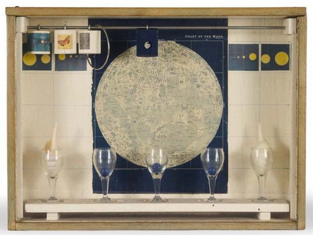 Un autre ouvrage de vulgarisation scientifique impacte également le travail de Cornell. Il s’agit d’Astronomie populaire de Camille Flammarion illustrant les découvertes astronomiques à l’aide de cartes célestes et figures gravées. Elles sont pour Cornell dès sa première boîte en 1936 une inlassable source d’inspiration. Il met ainsi en place une technique plastique où une carte de la lune sert de fond à une boîte dans laquelle il placera divers objets qui font écho à cette illustration, comme ici, les planètes, les étoiles et les constellations sur les timbres collés au cylindre, le bois et les coquillages représentant la terre en opposition à la lune.