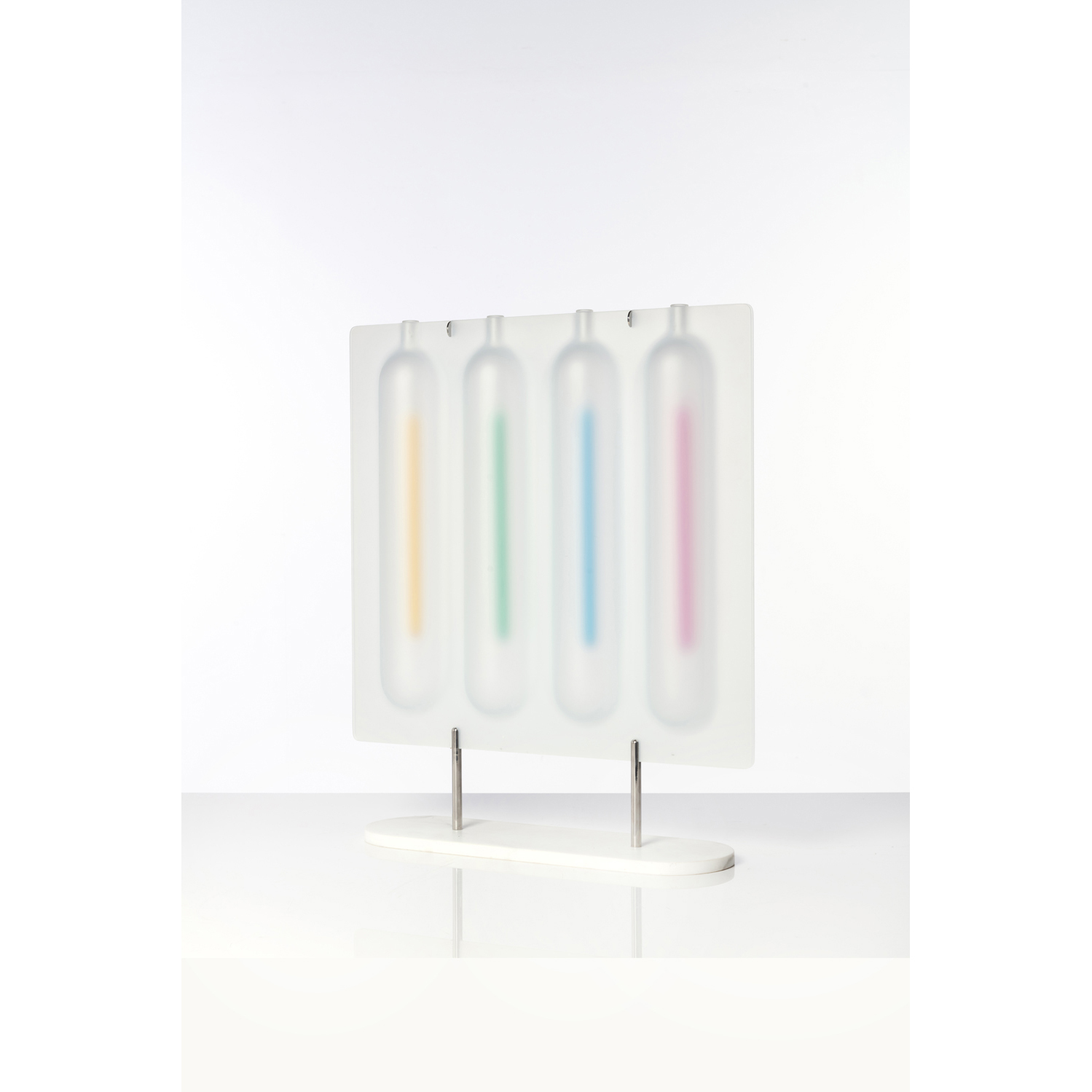 La douceur des courbes et l’ensemble épuré de l’oeuvre sont caractéristiques du travail de l’artiste. La sobriété de l’ensemble valorise chaque motif de verre, plaqué contre le quadrillage en fils d’acier. Transcender l’objet et outrepasser ses qualités usuelles, telle est la résolution de Andrea Branzi, qui, une fois de plus, allie technique et poésie dans une pièce d’une grande finesse.
