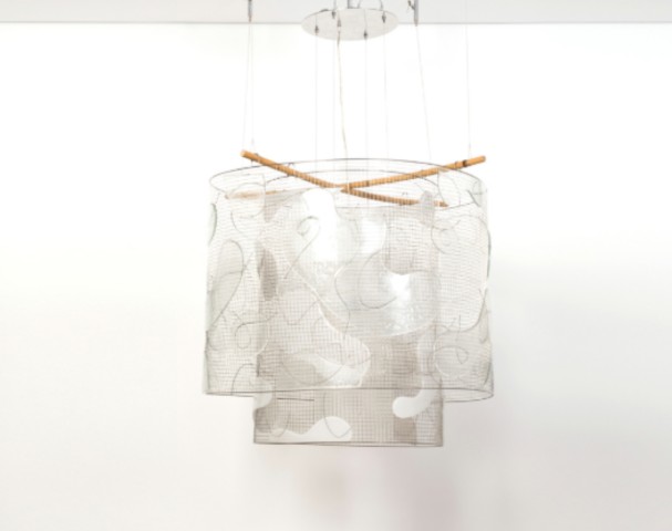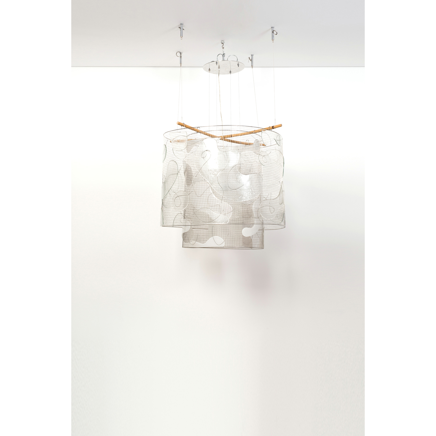 Bambou, treillis métallique, fil d’acier et verre opalin