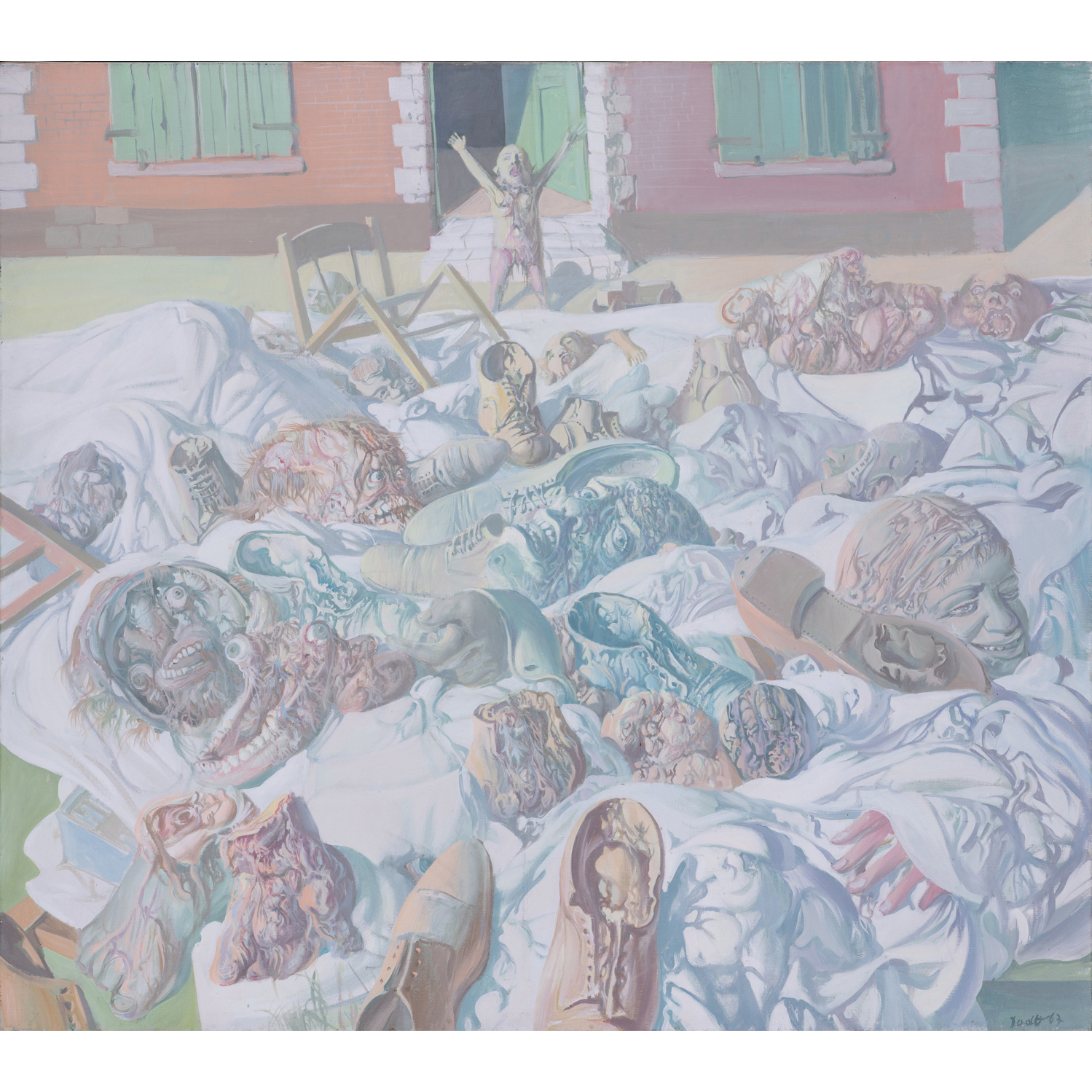 Ce monde de chair fraîche et de corps d’hôpital, est-ce l’éclosion de la vie, et déjà son malheur et sa destruction ? (…) Tout ce qui compose le monde de Dado, les bébés précoces, les vieillards prématurés et les pierres, tout se fendille. S’il y a des murs ou des monuments, ils s’effritent, tombent en ruine ». (Catalogue exposition Galerie Daniel Cordier, Francfort, 1960). Dans la peinture de Dado des années 1960, dont témoigne notre tableau, Expulsion Montrouge (1967) présentée à l'occasion de notre vente du mercredi 22 mai 2019, l’univers apocalyptique de l’artistique baigne dans un espace vaporeux rose et bleu pâle qui ne fait que renforcer la fadeur écœurante du spectacle des chairs en décomposition. Dado, qui a représenté en 2009 le Monténégro à la Biennale de Venise, a réalisé des peintures monumentales pour le pavillon de son pays natal à l'occasion de l'exposition universelle de 2010 à Shanghai.