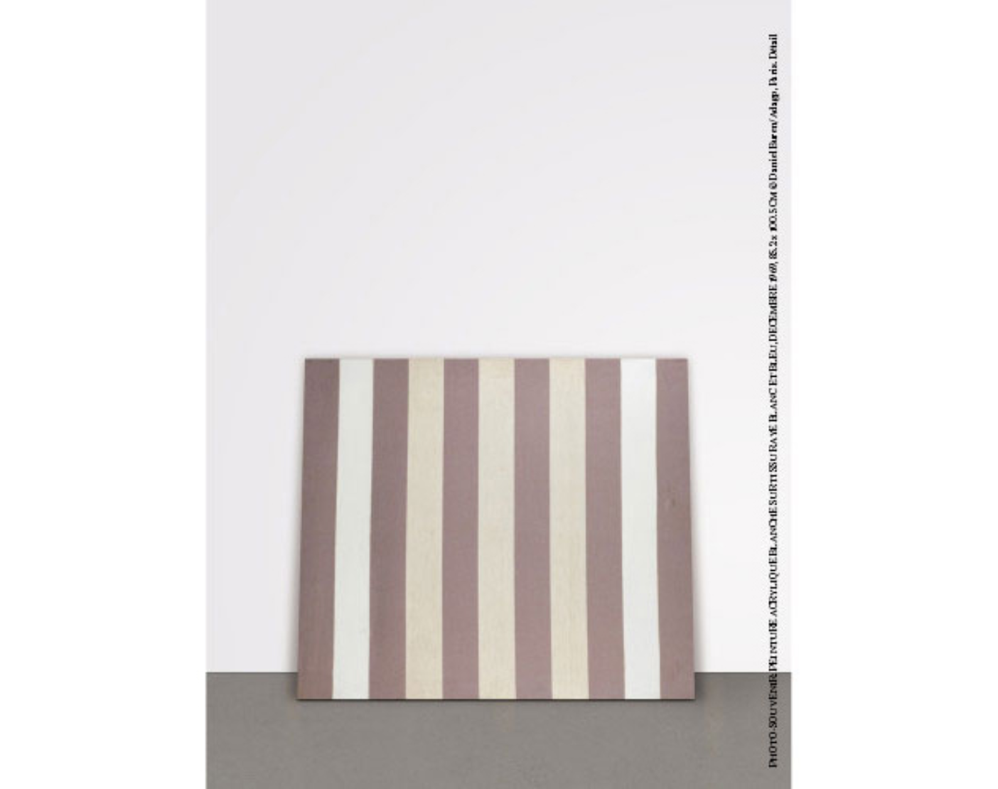 Comme en témoigne Peinture acrylique blanche sur tissu rayé blanc et bleu (1969), le sujet montré correspond à la seule technique employée : il est constitué de rayures verticales blanches et bleues, de 8,7 cm de largeur, les deux bandes extrêmes blanches étant recouvertes de peinture blanche, au recto et au verso. Par cette « réduction du fait peint » (Buren), l’artiste interroge et développe la notion de peinture jusqu’aux limites mêmes de son fonctionnement. Dépossédant la peinture de toute charge émotive, Buren ne révèle rien d’autre que sa réalité matérielle.