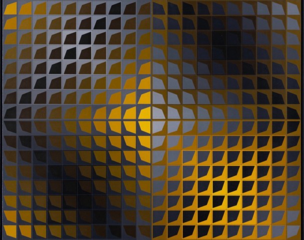 Si Vasarely s’autorise à introduire des éléments perturbateurs dans le modèle orthonormé de la grille, c’est pour mieux stimuler l’œil du spectateur : « Non seulement, l’art cinétique tient compte du fait que le spectateur construit sa vision (par la vision stéréoscopique des deux yeux et le balayage constant du champ visuel), mais, en plus, joue avec cet aspect actif de la vision, notamment en recherchant toutes les conditions ambigües qui font que cette vision ne peut se stabiliser sur une interprétation, mais est obligée d’osciller de l’une à l’autre. 1 » Afin de renforcer le processus de perturbation visuelle ainsi déclenché, Vasarely joue des dégradations subtiles et lumineuses du gris et du jaune, dans des teintes allant du plus foncé au plus pâle. Ces mutations morpho-chromatiques suscitent des sensations de mouvement de la surface, des effets de profondeur, de contraction, de dilatation et de vibration qui défient en permanence les habitudes perceptives du spectateur. Elles trahissent la conception originale qu’avait Vasarely de la création, celle-ci reposant sur une appréhension holistique du monde où l’artiste ne se situe plus en observateur distancié de la nature : elle est, écrit-il, une « identification aussi bien à la nature cosmique, qu’à la nature mathématique ou géométrique et même, pourquoi pas, à la nature physique ou chimique. De toute façon, l’artiste n’est plus l’observateur, le spectateur ou même l’être sensible qui, à la vue des êtres et des objets, se met dans un état de transe. Il participe, par le fait même qu’il est matériellement parlant la nature, au même titre qu’un arbre ou un nuage ; il participe au tourbillon matière, énergie, mouvement, temps, ondes. 2 » Loin d’être une codification systématique et une froide géométrisation, les œuvres de Vasarely, soustendue par une vision hallucinée et lyrique du monde, exprimaient avant tout le songe cosmique de l’artiste, celui d’échapper à toute limite matérielle pour s’étendre au-delà du commensurable : « Porté par les ondes, je fuis en avant, tantôt vers les atomes, tantôt vers les galaxies » 1 Vasarely, "Vasarely plasticien, un homme et son métier", Paris, Robert Laffont, p. 185. 2 Vasarely, "Plasti-cité. L’Oeuvre plastique dans votre vie quotidienne", op. cit., p. 47.