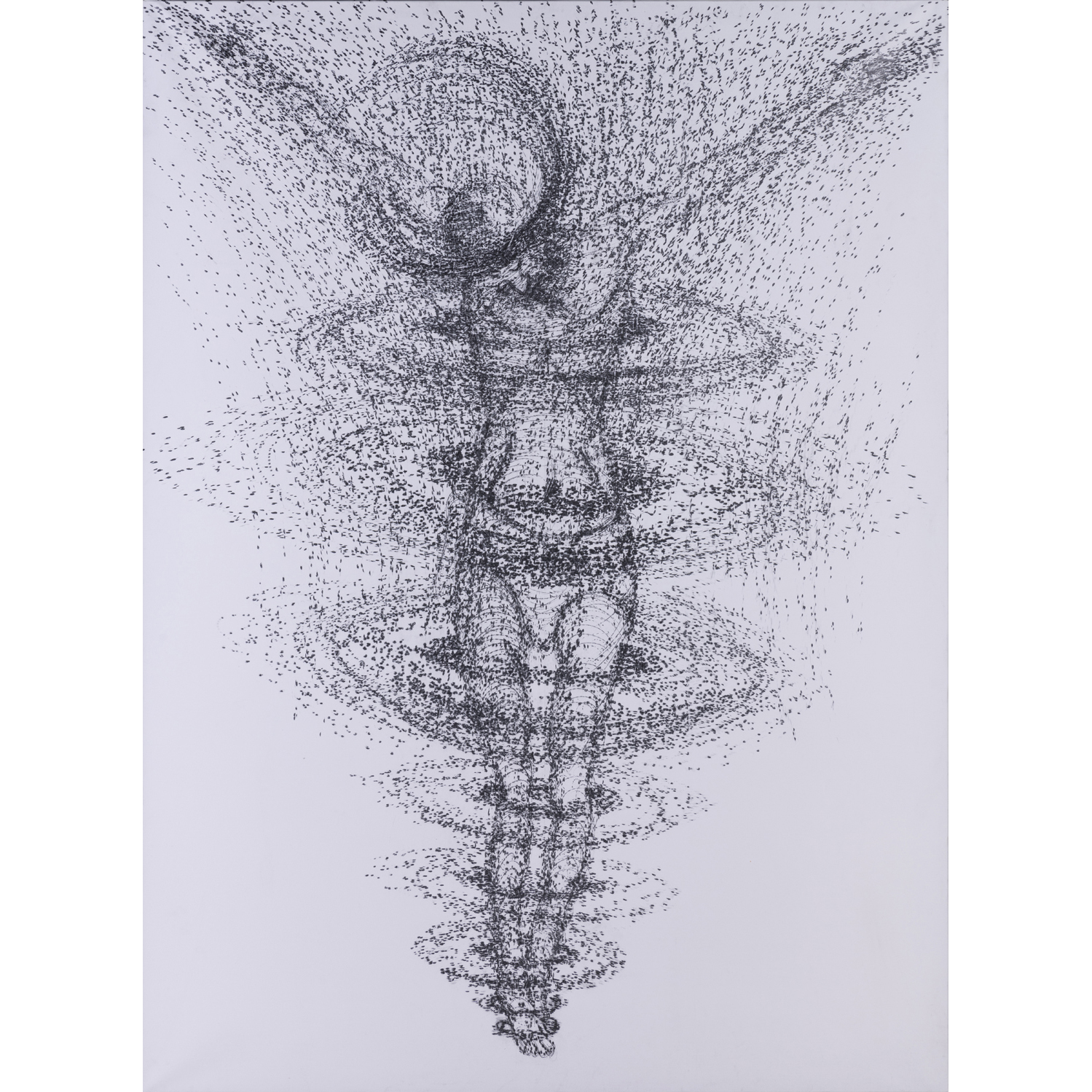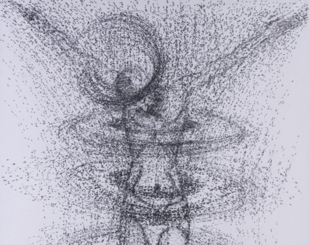 Cette technique m’intéresse car elle est aussi d’une certaine manière métaphore du derviche tourneur, qui, dans son tourbillon enchanteur, se confond avec les sons des coups de marteau sur l’enclume. Dans sa ronde, il se mêle à la cacophonie du monde, absorbant les bruits dans sa tenue au blanc immaculé. Sa silhouette en mouvement dessine le détour d’une cloche. Cette dernière appelle les fidèles et nous remémore que les mystiques musulmans sont aussi christiques. Les électrons dansant, laissés là sur le papier, se devaient d’enfermer un axe porteur de toutes ces histoires. Ainsi apparaît l’image du Christ dans mes dessins, premier derviche tourneur et noyau cosmique. La myriade d’électrons accompagne son ascension qui s’unit dans sa ronde au cosmos.