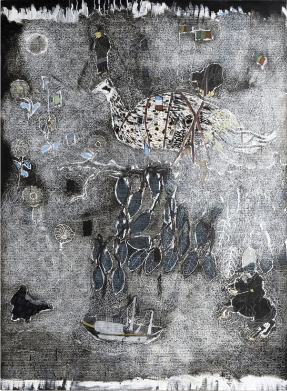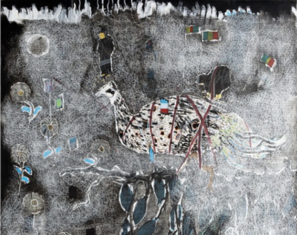 Dans « This Way is Not Easy 2 », l’iconographie foisonnante met en scène un bestiaire pluriel et hybride. Le rapport Nord/Sud et l’actualité du Continent africain nourrissent également son travail comme le suggère ce bateau flanqué d’une croix rouge. L’œuvre est estimée entre 25 000 et 35 000 euros. Au cours des années 2000, le travail d’Omar Ba fait l’objet de plusieurs expositions notamment à la galerie Templon de Paris et Bruxelles.