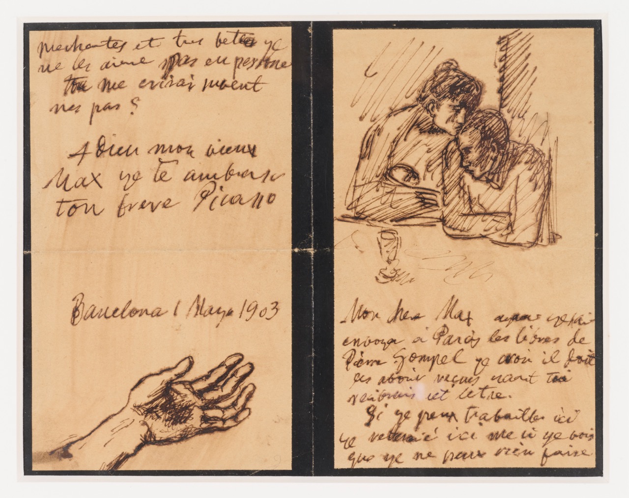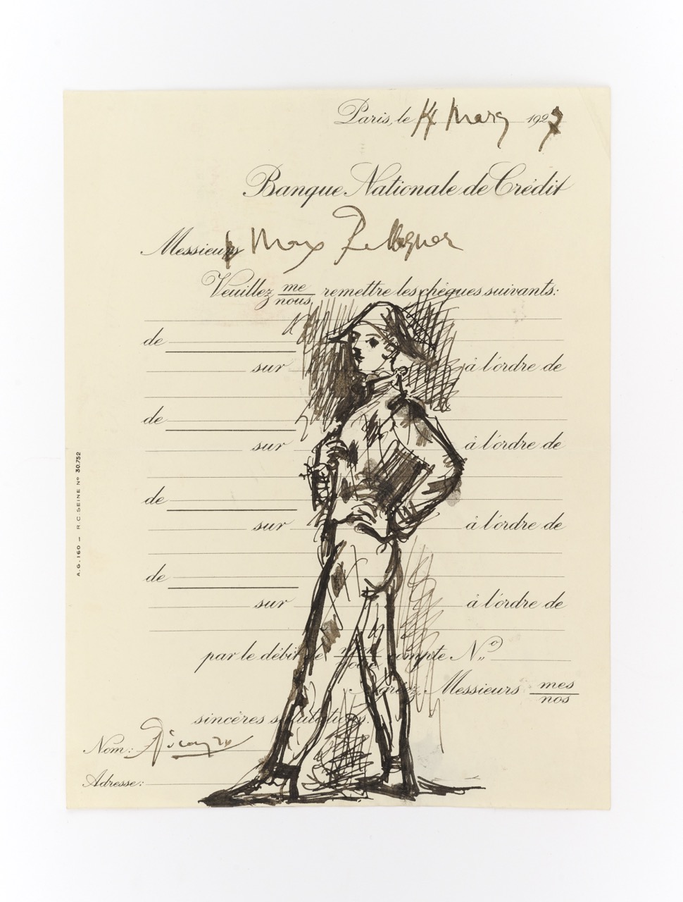 Dans cet esprit, on trouve également une lettre datée de 1903 que Picasso, arrivé à Paris deux ans plus tôt, a écrit à son grand ami d’alors Max Jacob, rencontré au Bateau Lavoir. Là encore, des croquis viennent réhausser le texte, au détail près que ces dessins préfigurent des détails et figures que Picasso va employer dans des œuvres majeures. Une pratique récurrente chez Picasso comme avec cet Arlequin griffonné à l’encre de chine sur un document bancaire à entête de la Banque Nationale de Crédit, propriété des frères Pellequer.