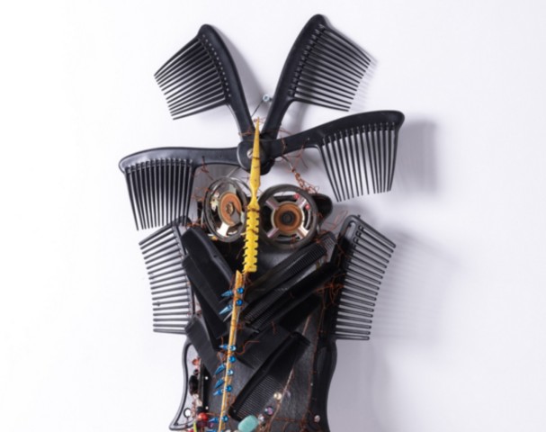 Calixte Dakpogan est né à Pahou, au Bénin. Il vit et travaille actuellement à Porto-Novo. Entouré d’une famille de forgerons et habitant un district de PortoNovo dédié à Ogun, dieu du fer, c’est avec son frère qu’il commence à créer des masques en récupérant la tôle des voitures et les déchets abondants des rues. Ses masques, anthropomorphes ou zoomorphes sont agrémentés de petits objets de consommation, comme des tongs, des bouteilles en verre, des cassettes ou des cadenas. L’œuvre présentée ici rend hommage aux soins apportés aux cheveux et à la coiffure en Afrique et sont une réflexion sur les babioles bon marché importées de Chine, comme les peignes, les bijoux et les décorations de Noël. Depuis 1990, ses œuvres ont été exposées à travers le monde, et dernièrement à la Fondation Louis Vuitton lors de l’exposition collective “Art/Afrique : le nouvel atelier”, en 2017. «Toutes mes sculptures parlent autant de mon pays le Bénin, ma culture, mon environnement, mes croyances que de ma vision du monde».