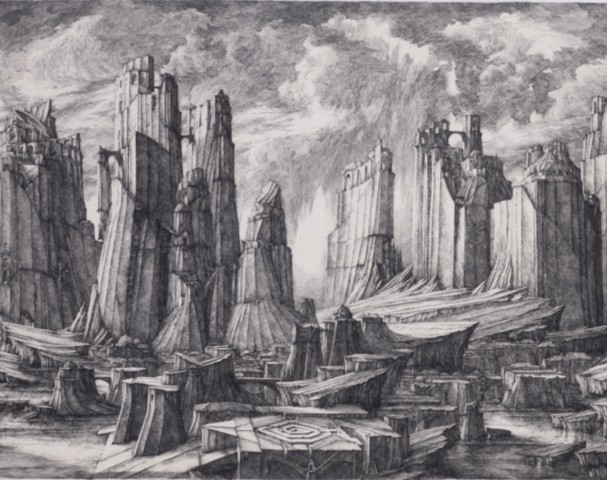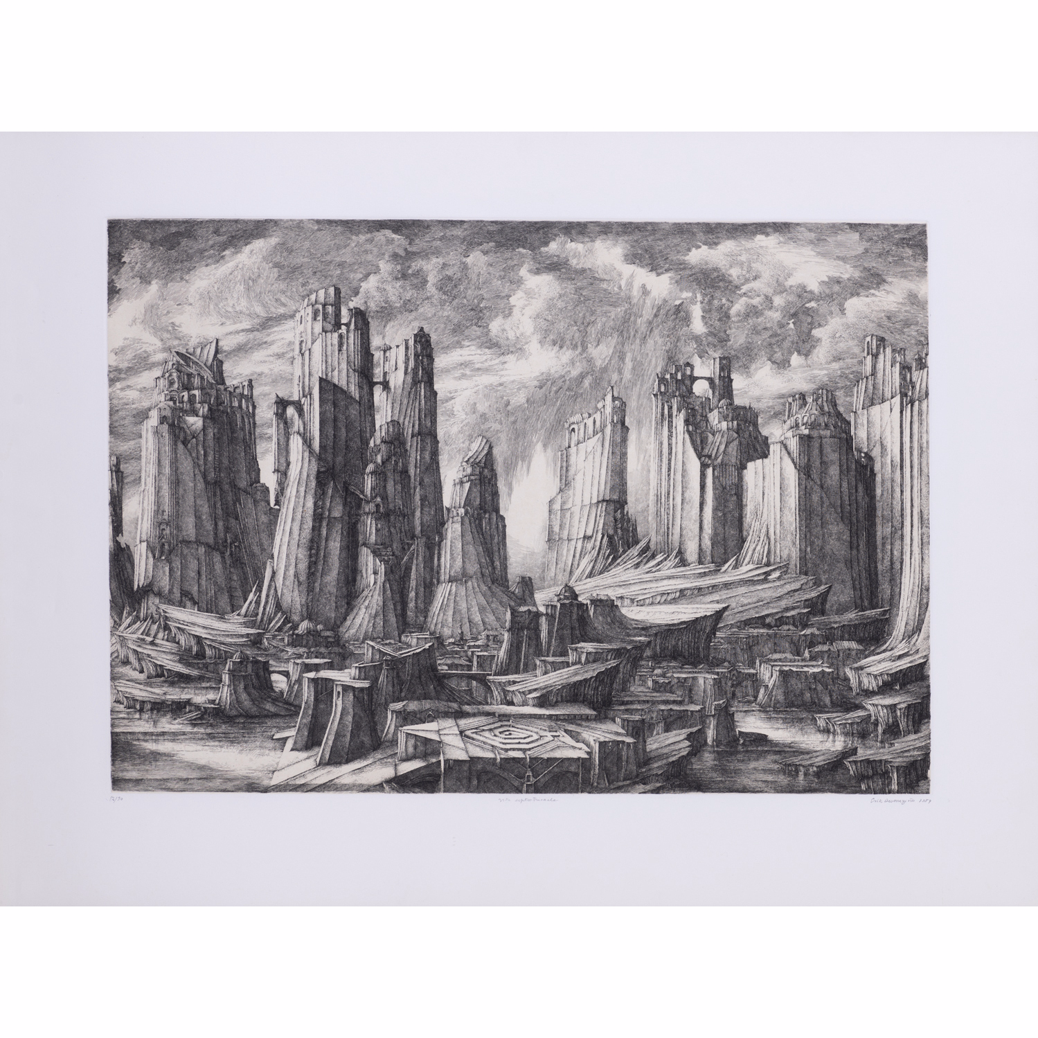 Les oeuvres d’Erik Desmazières allient virtuosité technique et vision onirique pour former un monde mystérieux à l’image de la gravure "Ville septentrionale" représentant des architectures foisonnantes et vertigineuses, jouant ainsi des lois de la perspective. La technique, eau forte et aquatinte, et une gravure minutieuses caractérisent l’oeuvre de Desmazières qui s’inscrit profondément dans le courant visionnaire.
