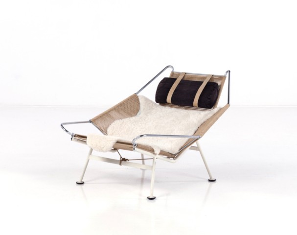 Autre modèle emblématique de Wegener, le modèle de fauteuil Flag Halyard conçu dans les années 1960. Avec ce design, Wegner rend hommage aux premiers modernistes tels que Le Corbusier, Mies van der Rohe et Marcel Breuer, et prouve qu'il maîtrise également l'utilisation des tubes en acier chromé. Les surfaces planes de la chaise sont faites d'une drisse longue et unique, recouverte d'une peau de mouton qui adoucit la froideur industrielle de l'acier.