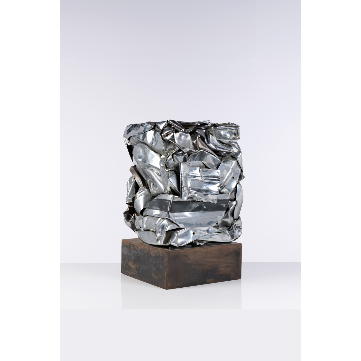 La célèbre série des « Compressions » de César fut initiée en 1960 après qu’il découvre fortuitement chez un ferrailleur de Gennevilliers une presse hydraulique américaine géante, capable d’engloutir la taille d’une voiture. Après ces « Compressions » des débuts, qualifiées de « brutes », César réalisa des « Compressions dirigées » dont il choisissait les éléments en fonction de leurs propriétés intrinsèques. Comme le montre notre Compression de pare-chocs (1960), les formes s’enchevêtrent avec une volonté marquée de composition, de façon à déterminer un bloc parallélépipédique dans leur empilement. Le degré de compression des formes a été pensé de manière à valoriser la qualité réfléchissante du métal des pare-chocs. Lorsque César présenta au XVIe Salon de Mai, en 1960, ses premières « Compressions », le public cria au scandale. Plus averti, le critique d’art Pierre Restany y vit une rupture décisive dans l’histoire de la sculpture, évoquant « un nouveau stade du métal », soumis à « une réduction quintessentielle ».
