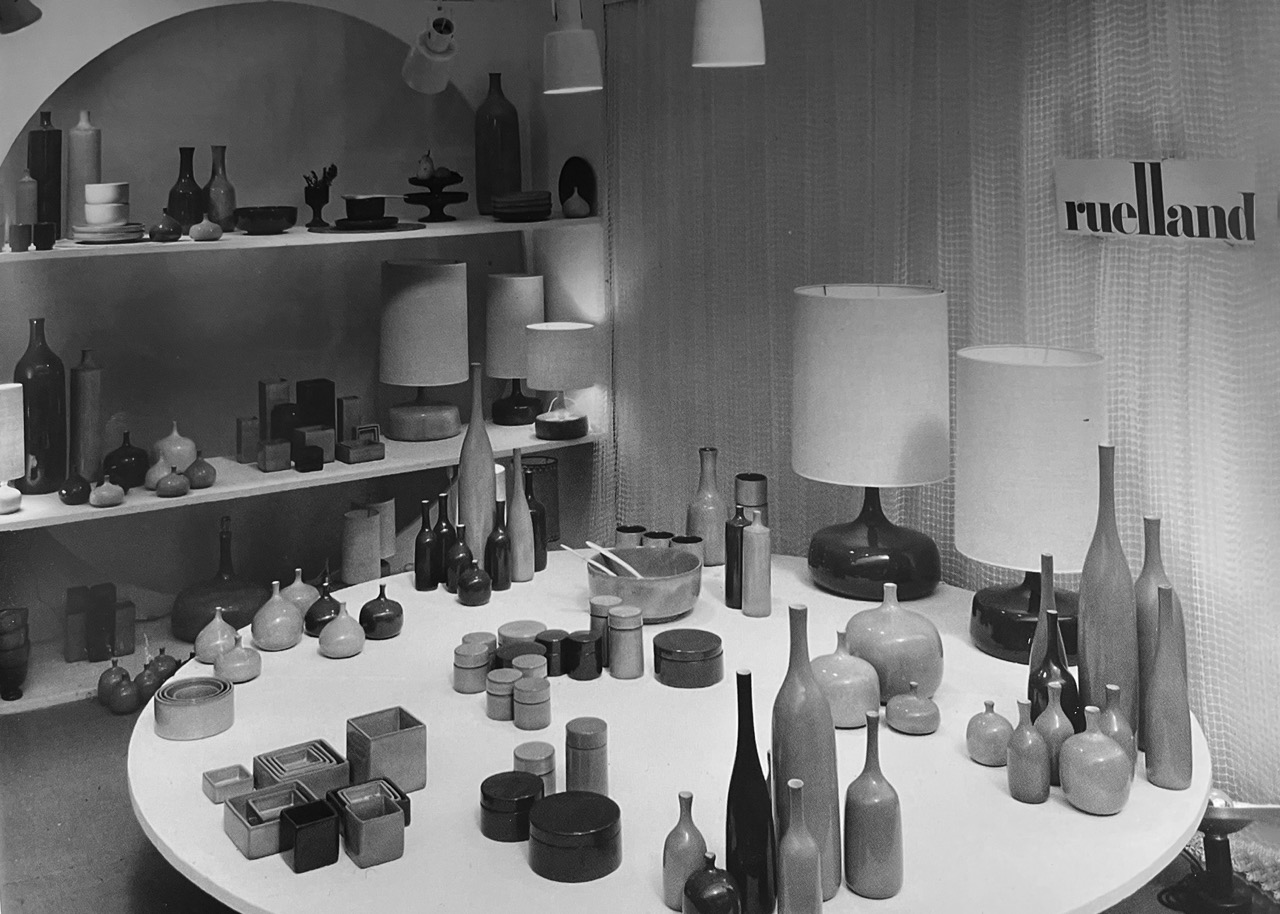 Le catalogue de la première vente de la rentrée de septembre - dédiée au design français - s’ouvre sur un ensemble d’un peu moins d’une cinquantaine de céramiques réalisées par Jacques et Dani Ruelland. Issues d’une collection particulière, elles ont été majoritairement créées entre 1955 et 1960. Le couple de créateurs, pionnier avec Georges Jouve ou Pierre Szekely de ce que Pierre Staudenmeyer, auteur de “La Céramique française des années 50” (Norma éditions, 2004), appelle “le Zen occidental”. Il est aussi l’inventeur en 1955, d’une technique associant la terre à l’oxyde de manganèse. Leurs objets se caractérisent par des formes épurés couvertes d’un émail brillant (Lampe, céramique émaillée et textile, vers 1960, 8 000 / 12 000 €) et sont conçus pour fonctionner en groupe (Ensemble composé de huit soliflores, deux vases et une coupe, céramique émaillée, 20 000 / 30 000 €).