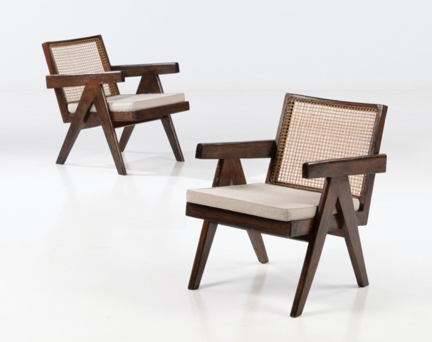 En 1951, le Premier ministre indien Nehru invite le Corbusier à construire ex nihilo la nouvelle capitale du Pendjab, Chandigarh. Bien qu'ils ne travaillent plus ensemble dans le même atelier depuis le début de la Seconde Guerre Mondiale, Le Corbusier fait appel à Pierre pour réaliser ce projet monumental. Ce dernier devient alors urbaniste officiel de l'État indien du Pendjab et se charge personnellement du mobilier. Le travail de Pierre Jeanneret à Chandigarh témoigne de l'acmé de sa collaboration avec Le Corbusier mais aussi du soucis de toujours concilier avec harmonie l'architecture moderne à la réalité du paysage indien. Ainsi, à l'image de notre paire de fauteuil en teck et cannage (lot 185), Pierre fiance les matériaux exotiques qu'il découvre en Inde aux formes épurées caractéristiques du style Corbusier.