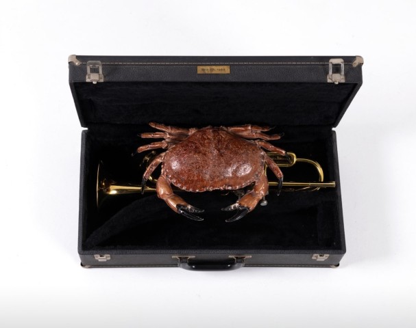Trompette sous un crabe, il s'agit d'une contrepèterie de "Tempête sous un crâne", est une reconstitution basée sur une illustration et une description. Il existe 3 exemplaires de cette œuvre tous différents.