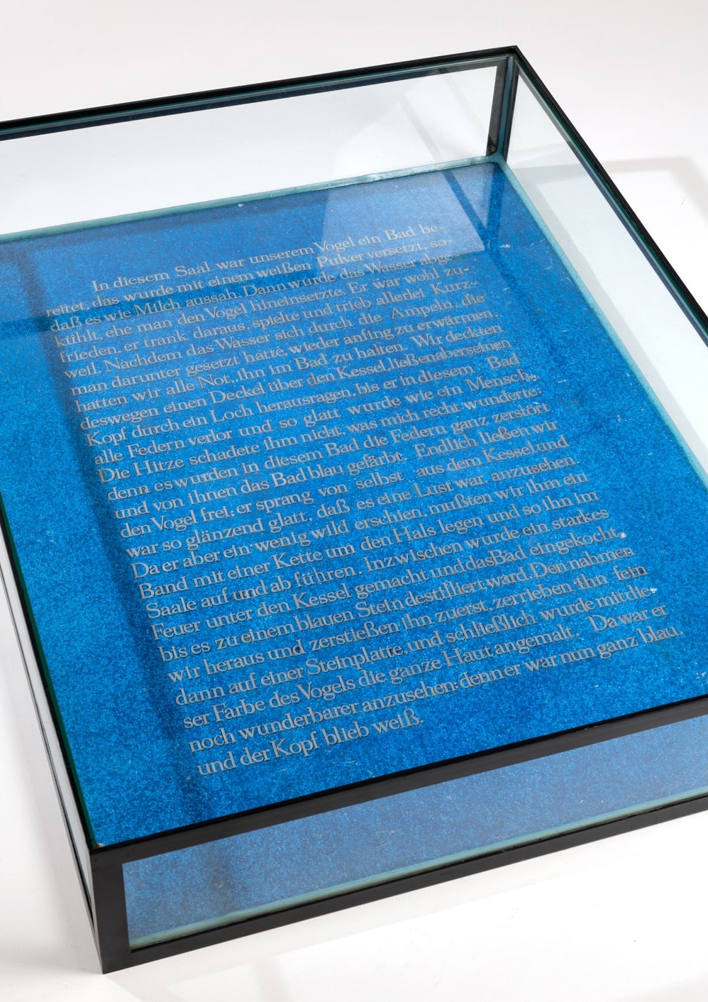 Chose étonnante, les plumes se dissolvèrent entièrement dans ce bain et le teignirent en bleu. Enfin nous laissâmes l'oiseau s'échapper de la chaudière; il était si lisse et si brillant qu'il faisait plaisir à voir ; mais comme il était un peu farouche nous dûmes lui passer un collier avec une chaîne autour du cou ; puis nous le promenâmes çà et là dans la salle. Pendant ce temps on alluma un grand feu sous la chaudière et le bain fut évaporé jusqu'a siccité, de sorte qu'il resta une matière bleue ; nous dûmes la détacher de la chaudière, la concasser, la pulvériser et la préparer sur une pierre ; puis cette peinture fut appliquée sur toute la peau de l'oiseau. Alors ce dernier prit un aspect plus singulier encore ; car, à part la tête qui resta blanche, il était entièrement bleu. »