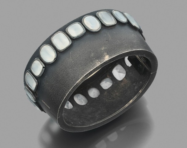 patiné noir orné d'une suite de pierres de lune de forme ovale et coussin en sertissure.