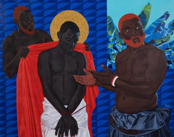 Très au-dessus de leur estimation comprise entre 5 000 et 8 000 euros, les deux œuvres de l’artiste camerounais Marc Padeu ont chacune atteint 195 000 euros. Les deux toiles The king is dead et Voici l’homme ! sont emblématiques du travail de l’artiste réinvestissant l’iconographie chrétienne et l’esthétique de la Renaissance.