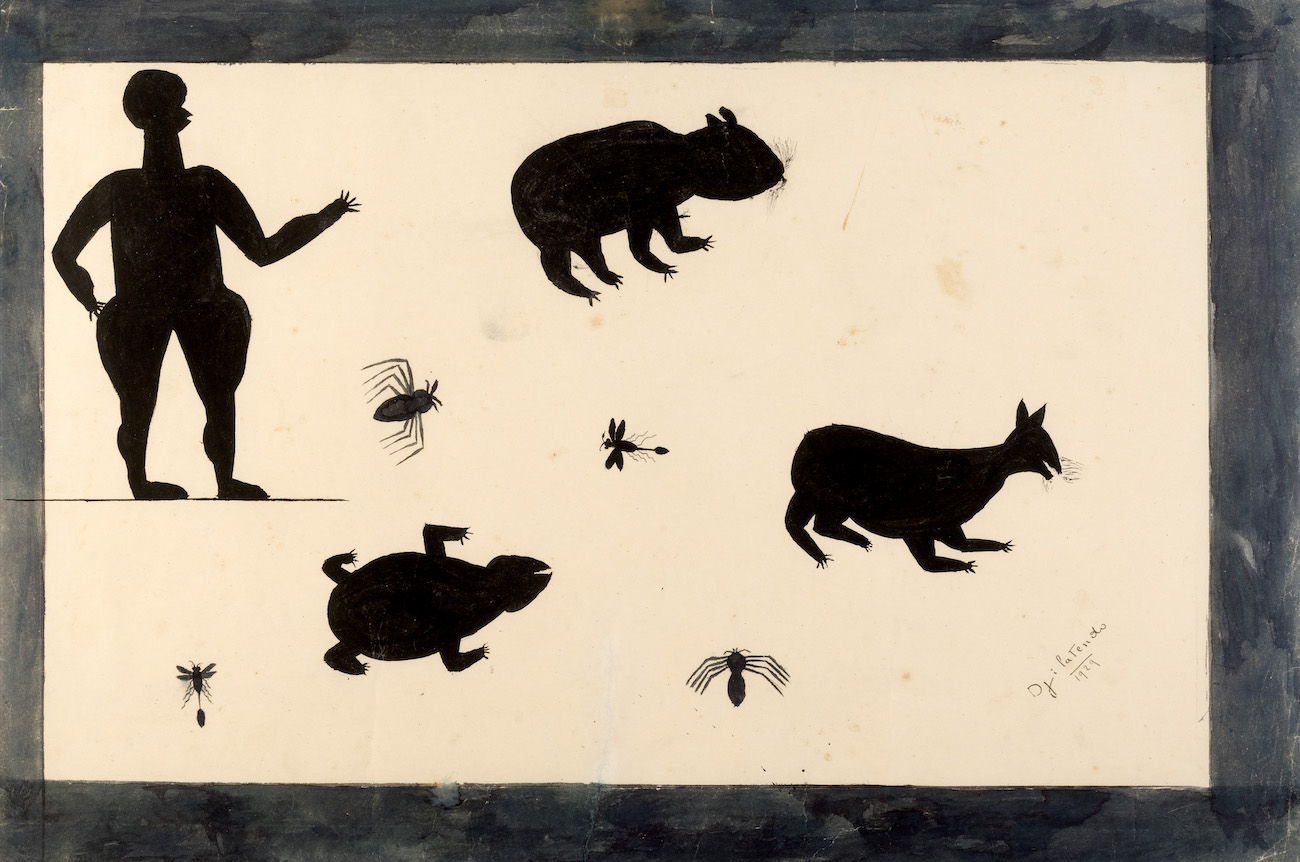 Le début de la période moderne de la peinture congolaise remonte aux années 1920. C’est alors que Georges Thiry, fonctionnaire colonial belge, s’étonne de la qualité artistique des décorations qui ornent les murs de certaines cases. Soucieux de leur pérennité, il décide de fournir à leurs auteurs, Djilatendo et au couple Albert et Antoinette Lubaki, des couleurs et du papier. Grâce à lui, cet art éphémère reproduit à l’aquarelle peut voyager. Lorsque Thiry rencontre Djilatendo, il est tailleur de vêtements, mais ce sont les peintures qu’il réalise sur les murs de sa case qui intéressent Thiry. Djilantendo est un artiste contemporain de son temps, tour à tour abstrait et figuratif, il puise son inspiration dans son environnement. Soit il décline en couleurs délavées les motifs de tapis du Kasaï, ou bien il représente à l’encre noire ou violette des ombres de personnages ou d’animaux. Sous domination coloniale, le personnage en pantalon bouffant dessiné sur le papier pourrait suggérer l’officier exerçant son contrôle sur les êtres de la création, persuadé qu’il a, dans son uniforme, autorité pour indiquer la marche à suivre aux animaux.