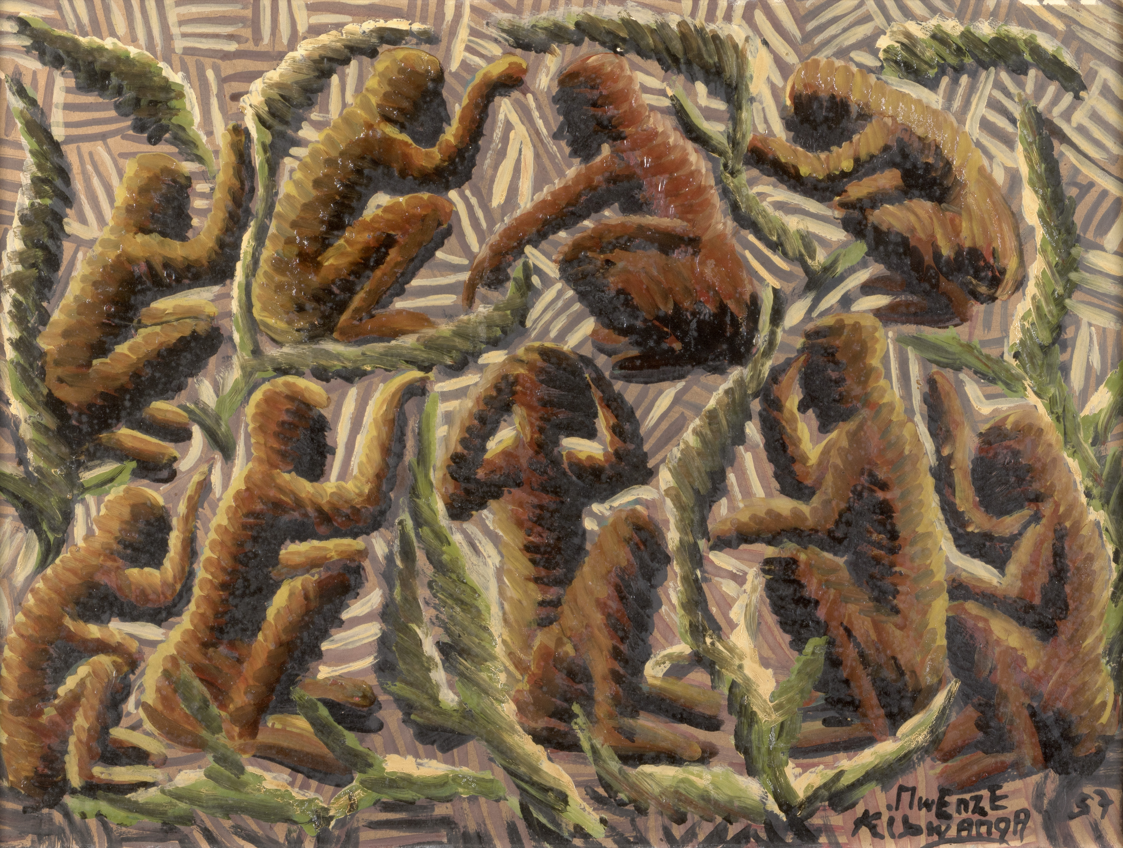 Mwenze est fils de tisserand. On retrouve dans son œuvre les motifs des tissus et des tapisseries traditionnels. Après avoir reçu des cours de dessin à la mission Protestante de Mwanza, il poursuit son enseignement chez les Méthodistes et se met à faire des portraits pour gagner sa vie. Quand il intègre l’atelier du Hangar, il a déjà acquis un style « académique ». Romain Desfossés l’encouragera à s’en détacher pour développer son propre style, si caractéristique de la hachure. Les traits de peinture sombre et claire alternent et font rayonner les animaux, les hommes, et les scènes mystiques ou religieuses. Mwenze nous confronte à une peinture plus sombre et plus dure. Dans des compositions tout aussi saturées de motifs et de scènes de vie, les personnages semblent contraints, les animaux pris dans une végétation envahissante de lianes qui enserrent. Non seulement le style mais aussi les sujets traités par Mwenze en font un artiste singulier.