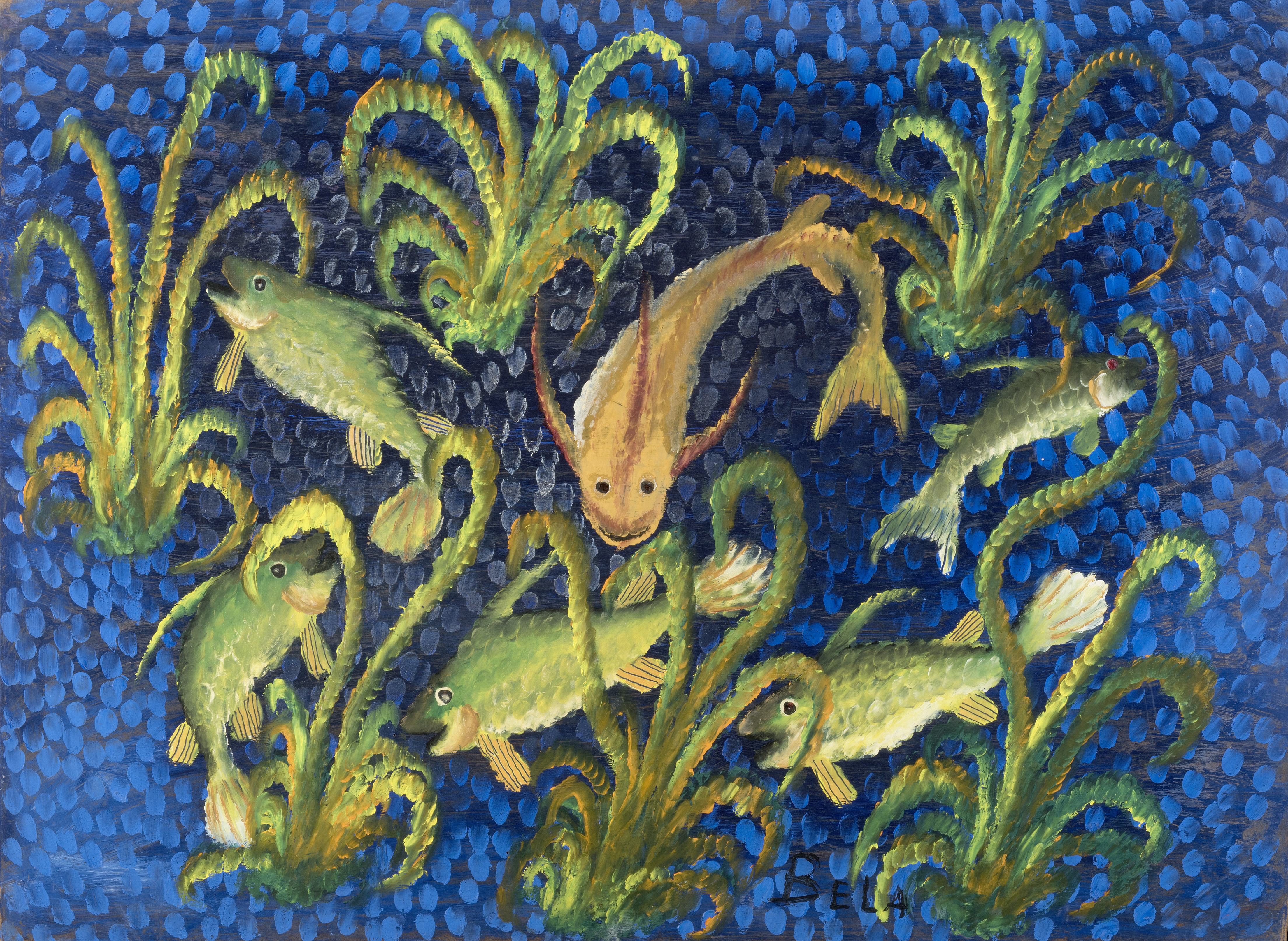 A son arrivée au Congo au début des années 1940, Pierre Romain-Desfossés rencontre son ordonnance Bela et le surprend en train de créer, en gravant des sujets dans le bois et en peignant avec ses doigts. Il l’encouragera à perfectionner sa technique de peinture digitale. Influencé par Romain Desfossés, Bela sublime la vie aquatique et représente des scènes de chasse dans une savane aux couleurs fauves. La traque du gibier ou la compétition des hommes avec les fauves revêtent un caractère mystique. Uniquement réalisées par des applications de peinture aux doigts, sans aucun contour, les huiles de Bela parviennent avec justesse à rendre la richesse des couleurs des poissons lacustres. Ceux-ci sont autant dans leur élément dans l’eau que lorsqu’ils jaillissent dans les airs. Bela suivra Pierre Romain-Desfossés tout au long de son périple en Afrique.