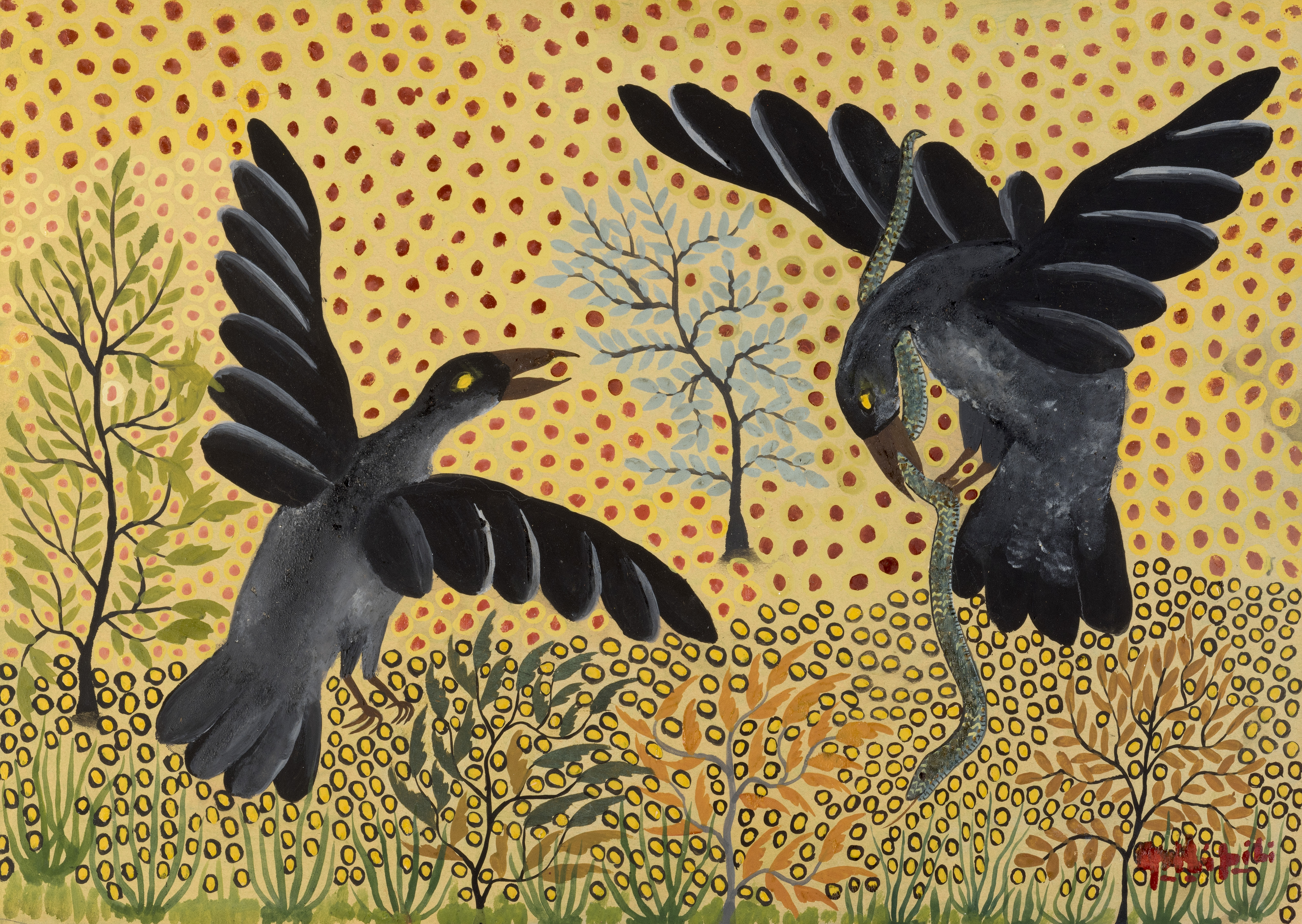 Pilipili est le fis d’un pêcheur et travaille comme peintre en bâtiment et plombier aux Travaux Publics quand il rencontre Romain-Desfossés qui l’intègrera au Hangar après 1947. Il en sera l’un des artistes les plus talentueux. S’il applique parfois un style décoratif avec force de motifs sériels et répétitifs, les dessins de Pilipili témoignent surtout du foisonnement de la nature. Elle semble scintiller sous de fies touches de couleurs vives, minutieusement appliquées sous forme de traits, de points et de cercles qui finissent par envahir l’espace.