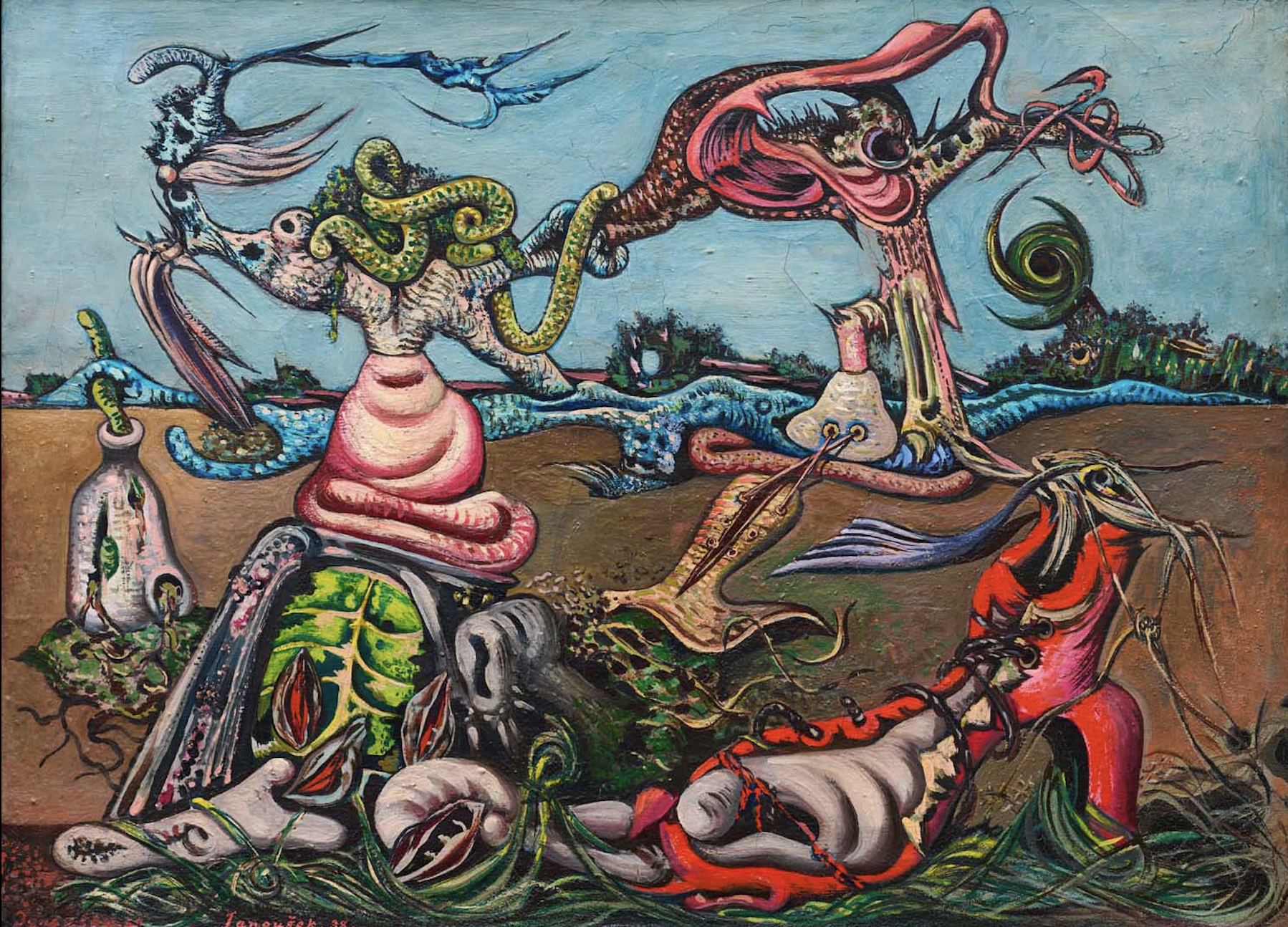 Les femmes ont tenu une place importante au sein du groupe. Quand certaines furent davantage des muses pour les surréalistes, comme Nusch Éluard dont nous présentons l’un des rares collages, d’autres furent des artistes consacrées comme Kay Sage ou Dorothea Tanning avec notamment cette importante peinture intitulée Les Trois Garces.