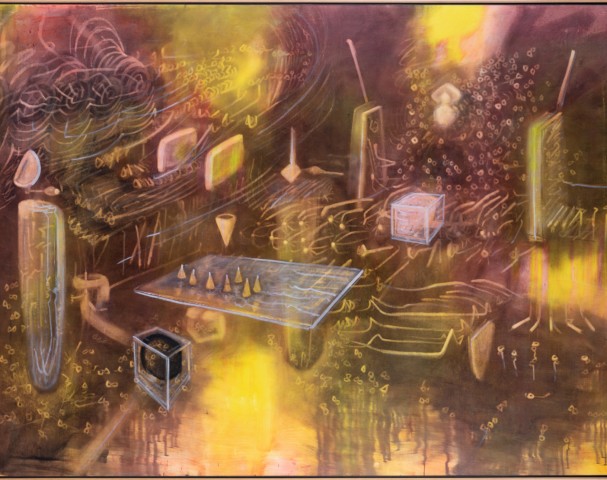 Lorsque sa peinture ne s’engage pas dans la réalité sociale et historique de son époque, elle se situe hors du temps et s’avère très convaincante par son fort pouvoir métaphorique. Ainsi, Rooming life (1977), dont le format imposant est digne d ela peinture d’histoire, présente une composition en mouvement, où des objets signes vaguement anthropomorphiques cohabitent avec des éléments mécaniques selon un esprit proche du Grand Verre. Ils semblent soumis à une force rotative dans un espace unifié et flottant, dont la profondeur est donnée par leur mise en perspective, par le jeu des variations de couleur, les alternances de zones d’opacité et de transparence. Des réseaux de lignes vibrantes, quelques inscriptions abstraites, renforcent le sentiment de vitesse et donnent l’impression d’un monde en perpétuel bouillonnement. Par ces espaces énigmatiques, Matta offre au spectateur d’autres formes de connaissance du monde, inaccessibles à nos capacités perceptives, et qui paraissent en incessante mutation. Ils sont, comme l’a relevé Édouard Glissant, comme « des préfigurations d’espaces sidéraux, des visions de ce monde auquel l’humanité conformera sa sensibilité quand elle en aura exploré dans l’imaginaire ou le réel, toutes les dimensions possibles » (Édouard Glissant, Le troisième œil, préface rédigée pour le catalogue de l’exposition « Matta », Centre culturel d’ Issoire, 1987).