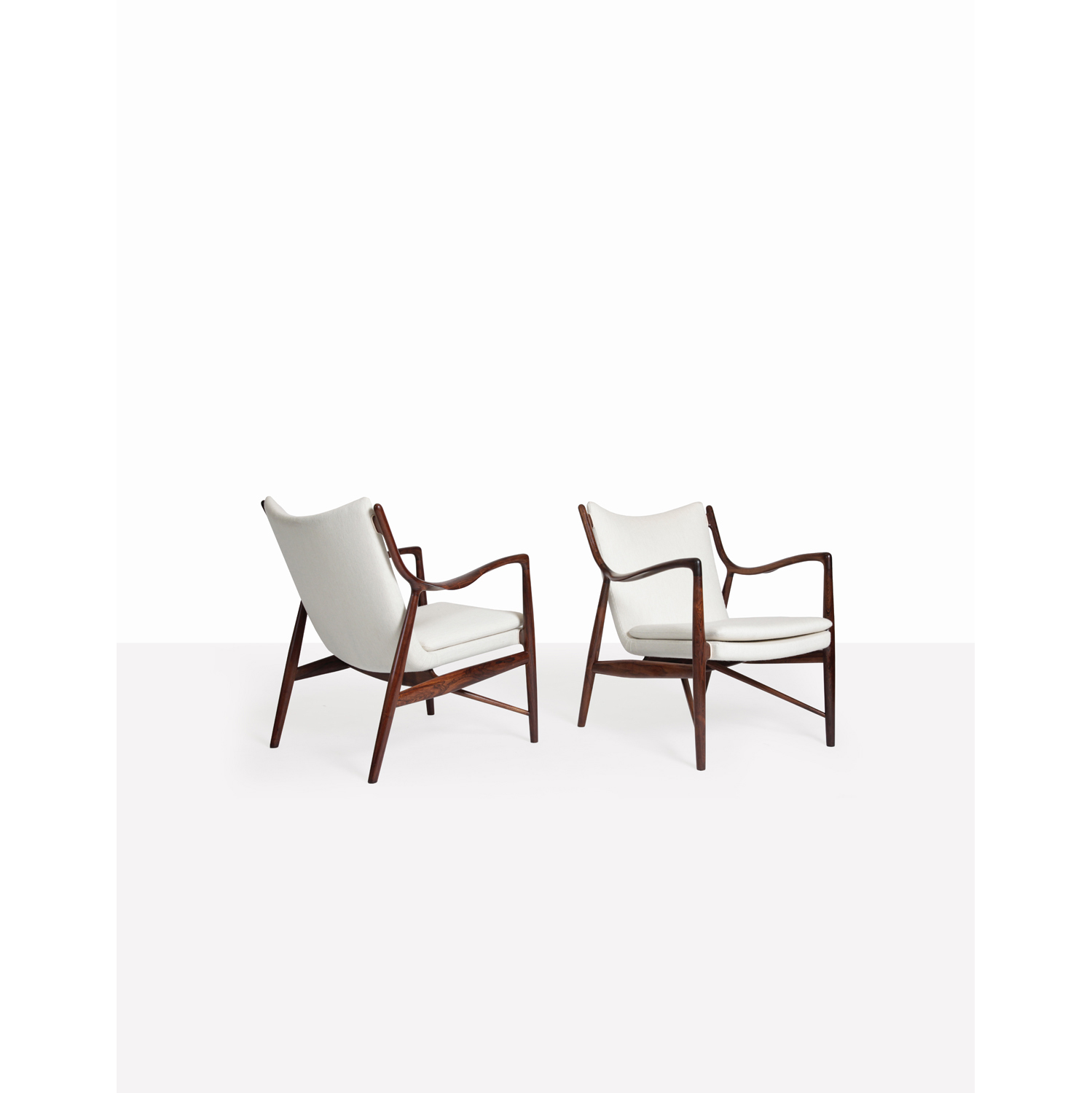 La paire de fauteuils NV-45 présentée est un des modèle les plus emblématique de Finn Juhl, designer considéré encore aujourd’hui comme le père du style « Danish modern ». Cette pièce fut présentée lors de l’exposition de l’association des ébénistes de Copenhague en 1945 et désignée comme “le père de tous les fauteuils modernes” par le professeur Chinois et expert en fauteuil Mr. Noritsugu Oda.