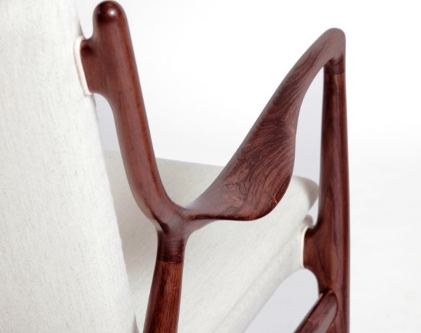 Finn Juhl crée avec le modèle 45 un fauteuil à la fois élégant et singulier au style innovant. La forme organique combinée avec cet espace entre le cadre et l’assise dégagent un sentiment de légèreté. Finn Juhl, né le 30 janvier 1912 à Frederiksberg, est considéré comme un pionnier du design moderne au Danemark. Il étudie l'architecture au sein de l’Académie royale des beaux-arts, et travaille d’abord avec Vilhelm Lauritzen. Il crée ensuite un premier ensemble de meubles destinés à sa propre maison en collaboration avec l’ébéniste Niels Vodder. En 1945 il ouvre son propre bureau de design et se fait rapidement remarquer par ses lignes pures et organiques.