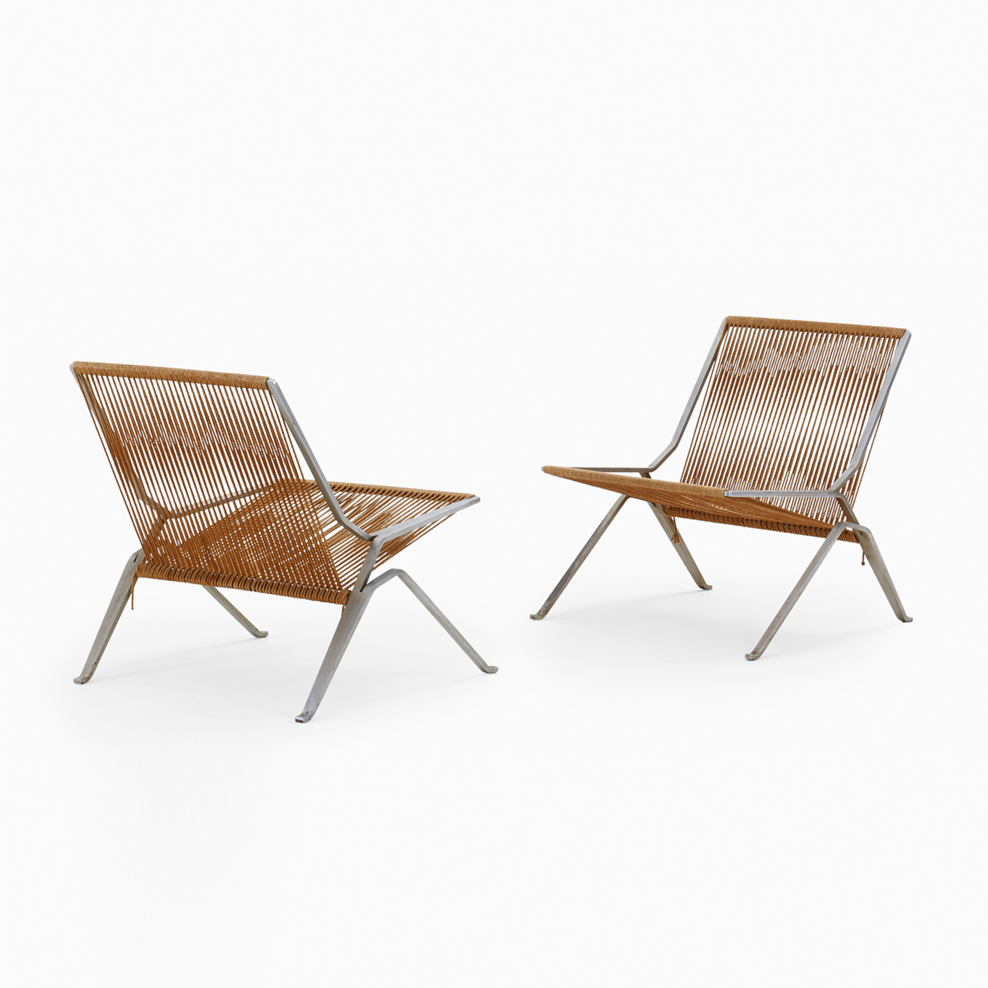 Poul Kjaerholm (1929-1980) Modèle PK25, paire de fauteuils Acier inox satiné et cordage d'origine Résultat : 96 200€ | Paavo Tynell (1890-1973) Snowflake, Suspension Laiton doré et métal Résultat : 62 400 € |