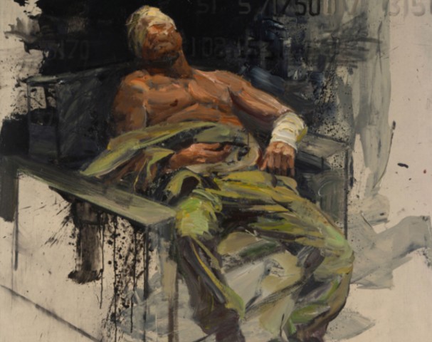 Parmi ses œuvres que PIASA propose à la vente dans cette sélection du mercredi 30 septembre 2020, Untitled, réalisé en 2020, figure un soldat blessé assis dans un fauteuil. Des bandages blancs entourent son bras gauche et le sommet du crâne. Des numéros d’immatriculation militaire se promènent dans le fond gris et noir. Sur le sol qui parait glisser à la vertical, une trace de sang témoigne de la violence qui dû précéder l’instant choisi par l’artiste. Cette pièce, caractéristique tant par sa facture que par son sujet, a été estimée entre 12 000 et 18 000 euros.