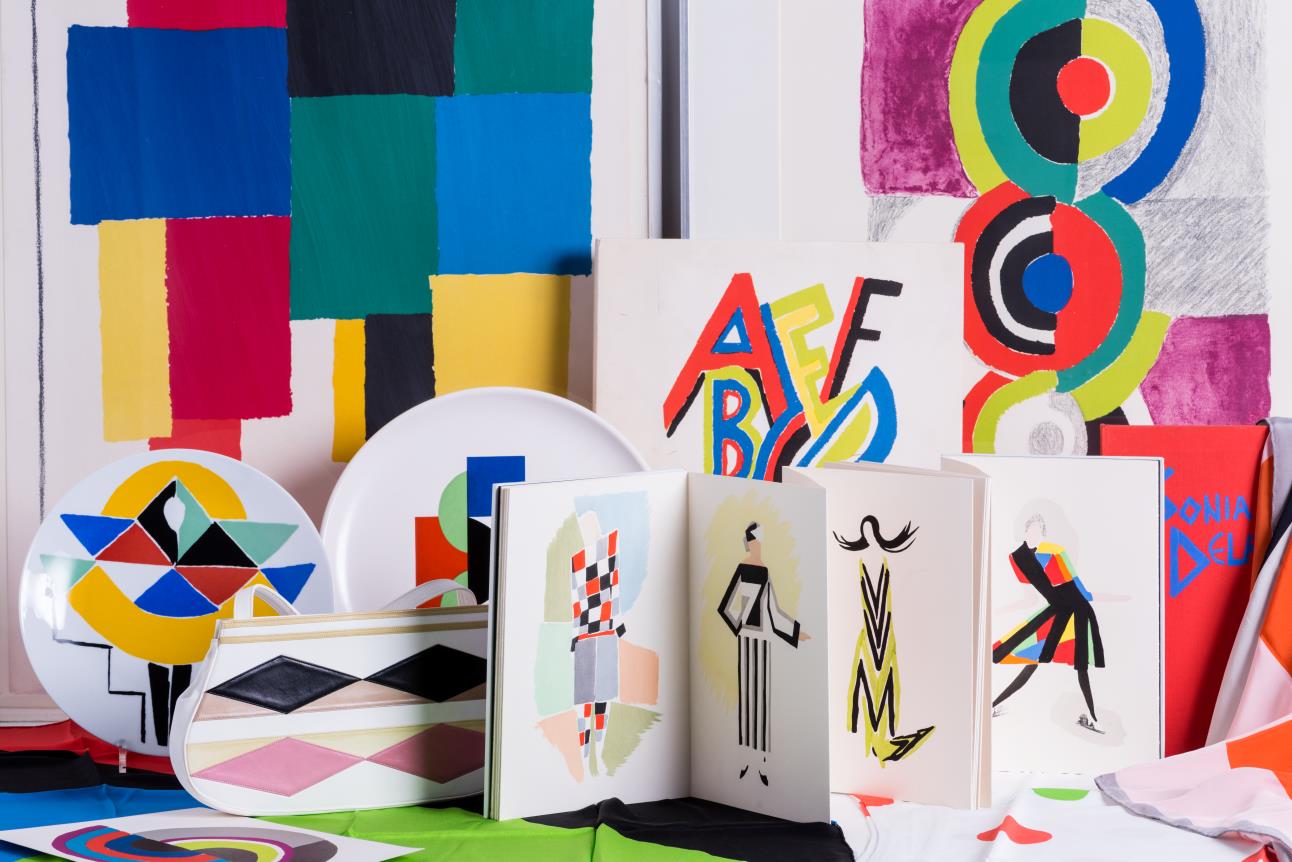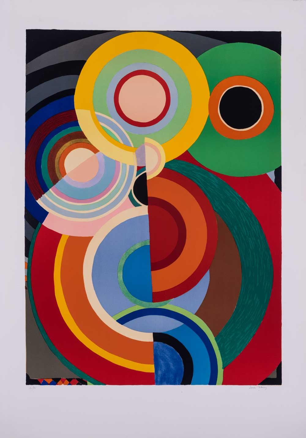 Artiste, décoratrice, créatrice de mode, Sonia Delaunay est une figure pionnière de l’abstraction picturale. Tout au long de sa carrière, elle n’a eu de cesse de chercher à briser les frontières entre les arts afin d’offrir une véritable réconciliation entre l’art et la vie. Elle collabore dès les années 20 avec Coco Chanel puis avec Blaise Cendrars ; dessine des costumes et décors pour Serge Diaghilev et bien sûr elle peint. Dans les années 1930, en France et aux Etats-Unis, Sonia Delaunay développe également de nombreux projets d’éditions et concrétise le renouvellement formel des œuvres et leur extension sur des supports variés.