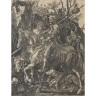 ALBRECHT DURER d'après Le chevalier, la mort et le diable gravure en copie d’après le burin original répertorié dans Bartsch, n° 98. Petits plis et rousseurs, légèrement jaunie coupée au sujet. 24,2 x 18,5cm On y joint : ALBRECHT DURER d'après Le fis prodigue au milieu des porcs reproduction Amand - Durand. 24,2 x 18,6 cm Provenance : Succ. Madame de L.