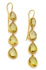Paire de pendants d'oreilles en or jaune 18k (750‰) ornés d'une chute de péridots sertis clos Poinçon de Maître Orfèvre Hauteur : 6 cm Poids brut : 9 g
